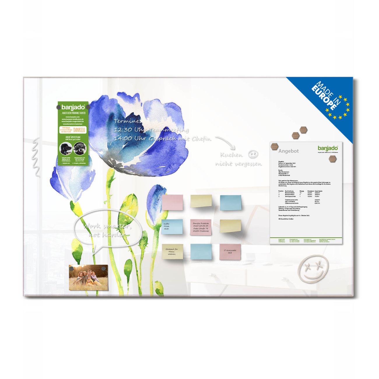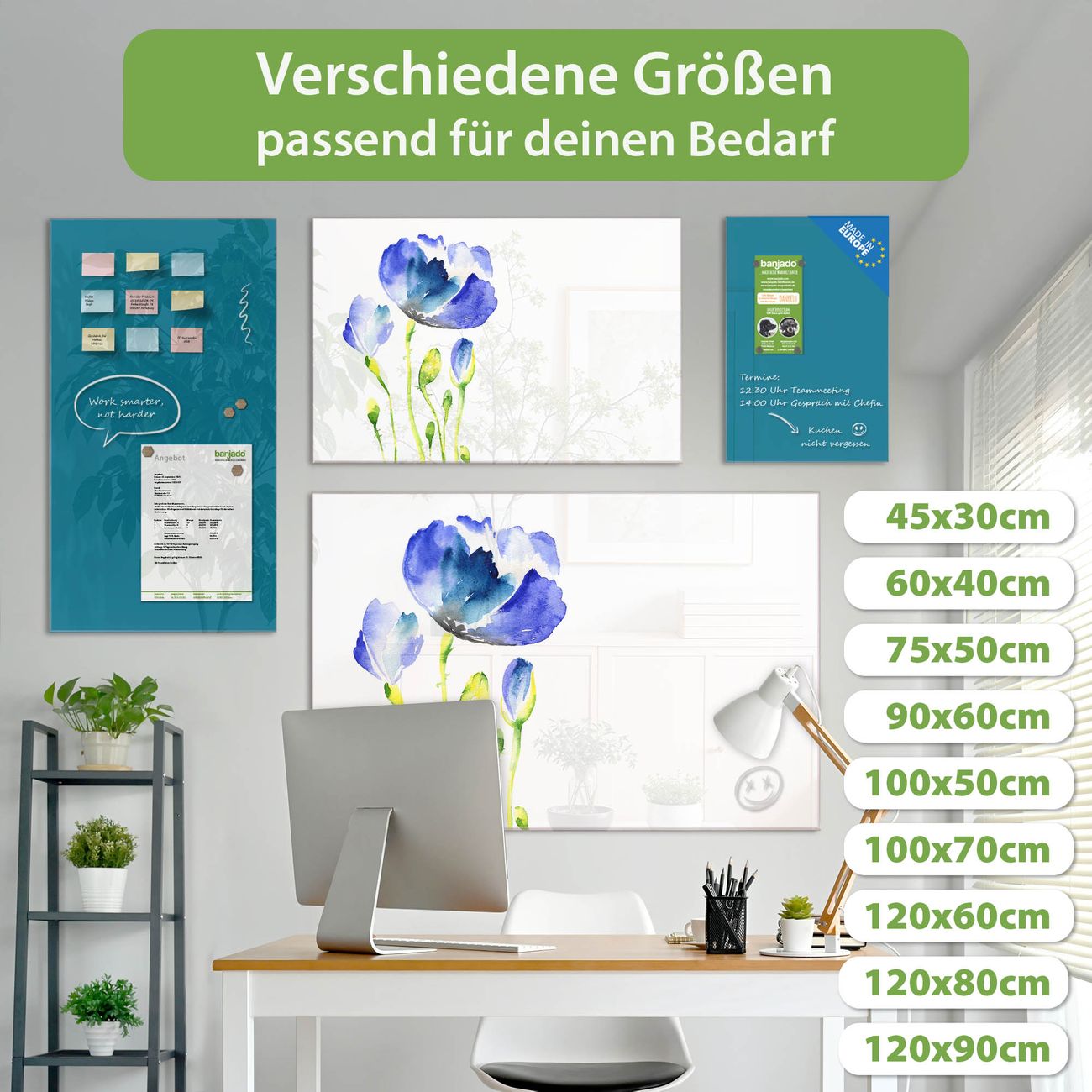 Material: 4mm Sicherheitsglas mit Metallrückwand Eigenschaften: beschreibbar, magnetisch, kratzfest Maße: 90x60x0,6cm, 8,10kg schwer Motiv Nummer 12933 Blauer Mohn Zubehör: inklusive 4 Neodym-Magnete