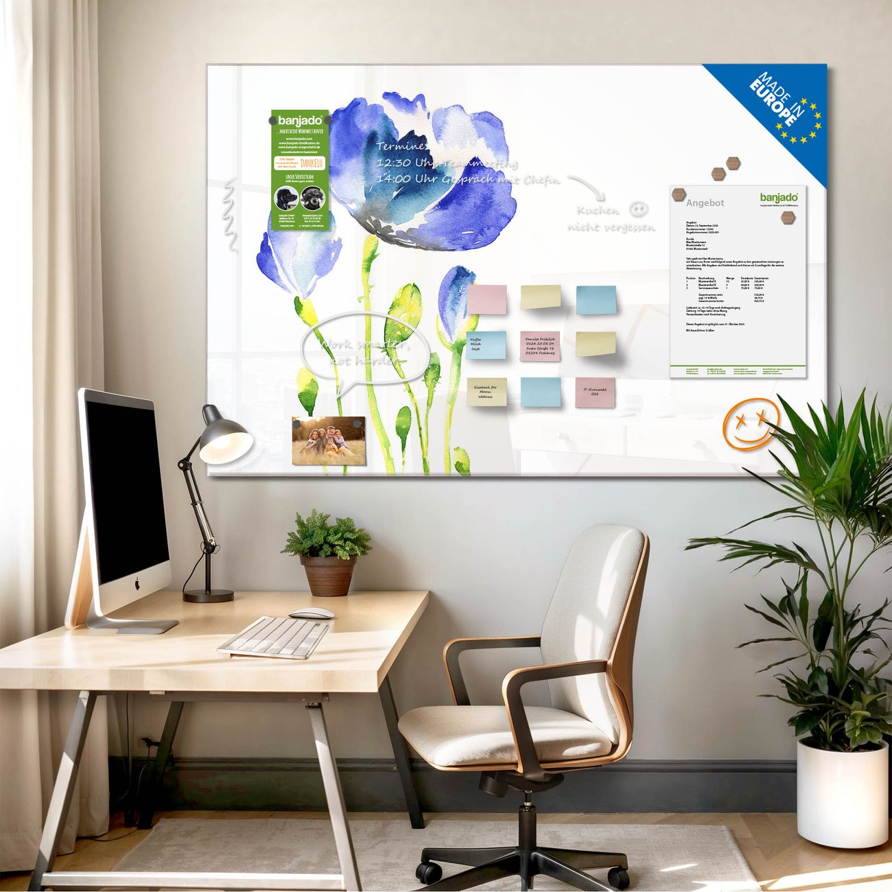 Die banjado Glas Magnettafel mit dem Motiv Motiv Blauer Mohn verbindet Funktionalität mit Stil. Sie ersetzt das Zettelchaos durch klare Strukturen und bringt dabei eine warme, natürliche Atmosphäre in Ihr Zuhause. Ob im Büro, in der Küche oder im Eingangsbereich - dieses Design-Board zieht Blicke an und sorgt für Ordnung mit Charakter.