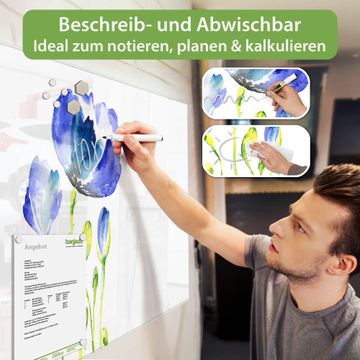 Auf der glatten Glasoberfläche lassen sich Termine, Rezepte oder Notizen ganz einfach mit Kreidestiften festhalten und rückstandslos entfernen. Starke Neodym-Magnete halten Ihre wichtigsten Erinnerungen sicher an Ort und Stelle. So entsteht Ihre ganz persönliche Ideenwand - jeden Tag neu.