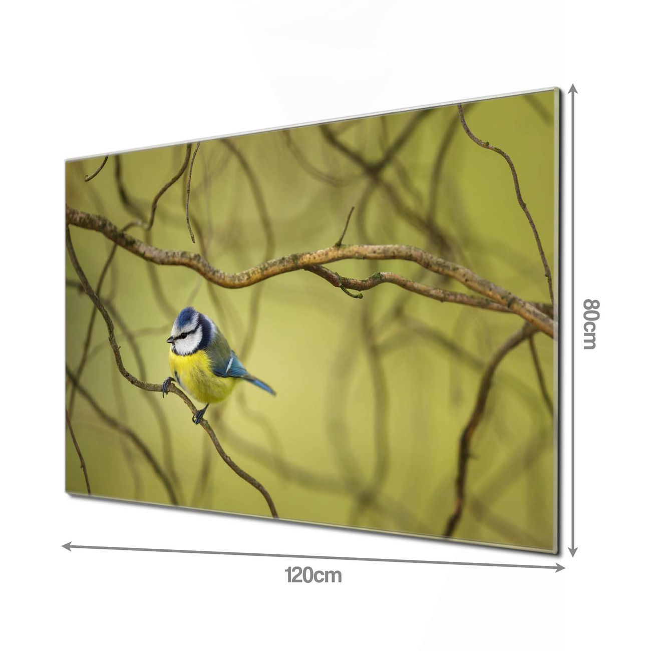 Material: 4mm Sicherheitsglas mit Metallrückwand Eigenschaften: beschreibbar, magnetisch, kratzfest Maße: 120x80x0,6cm, 14,40kg schwer Motiv Nummer 12828 Blaumeise im Baum Zubehör: inklusive 4 Neodym-Magnete