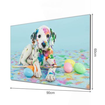 Material: 4mm Sicherheitsglas mit Metallrückwand Eigenschaften: beschreibbar, magnetisch, kratzfest Maße: 90x60x0,6cm, 8,10kg schwer Motiv Nummer 12792 Bunter Dalmatiner Zubehör: inklusive 4 Neodym-Magnete