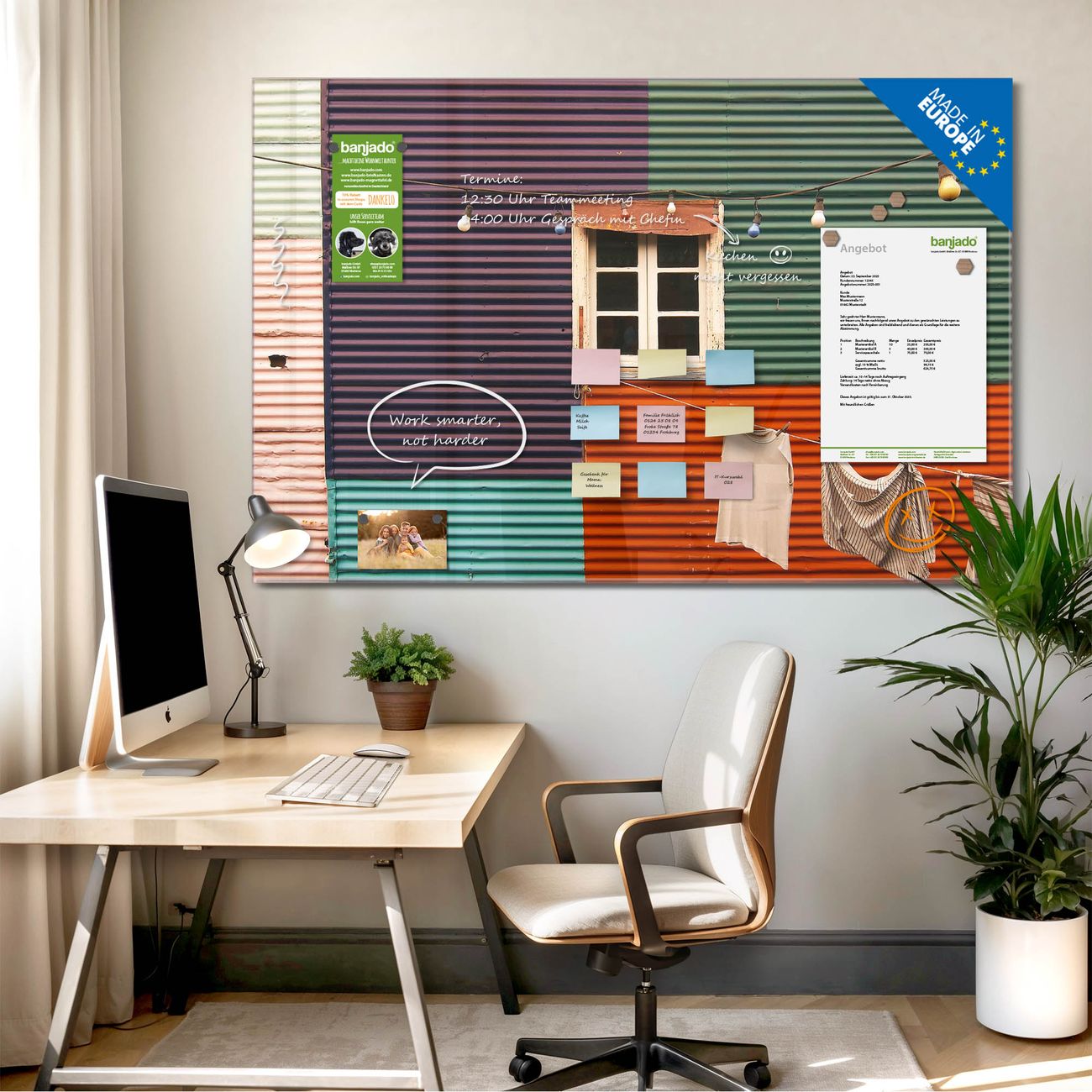 Die banjado Glas Magnettafel mit dem Motiv Motiv Buntes Haus verbindet Funktionalität mit Stil. Sie ersetzt das Zettelchaos durch klare Strukturen und bringt dabei eine warme, natürliche Atmosphäre in Ihr Zuhause. Ob im Büro, in der Küche oder im Eingangsbereich - dieses Design-Board zieht Blicke an und sorgt für Ordnung mit Charakter.