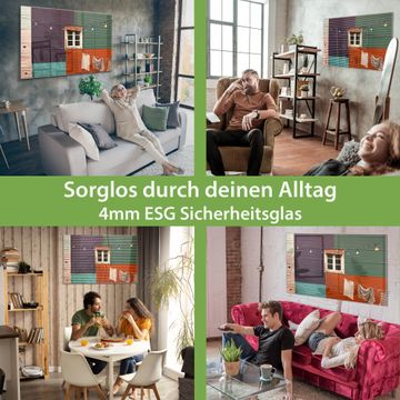 Material: 4mm Sicherheitsglas mit Metallrückwand Eigenschaften: beschreibbar, magnetisch, kratzfest Maße: 45x30x0,6cm, 2,03kg schwer Motiv Nummer 10655 Buntes Haus Zubehör: inklusive 4 Neodym-Magnete