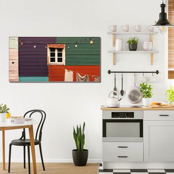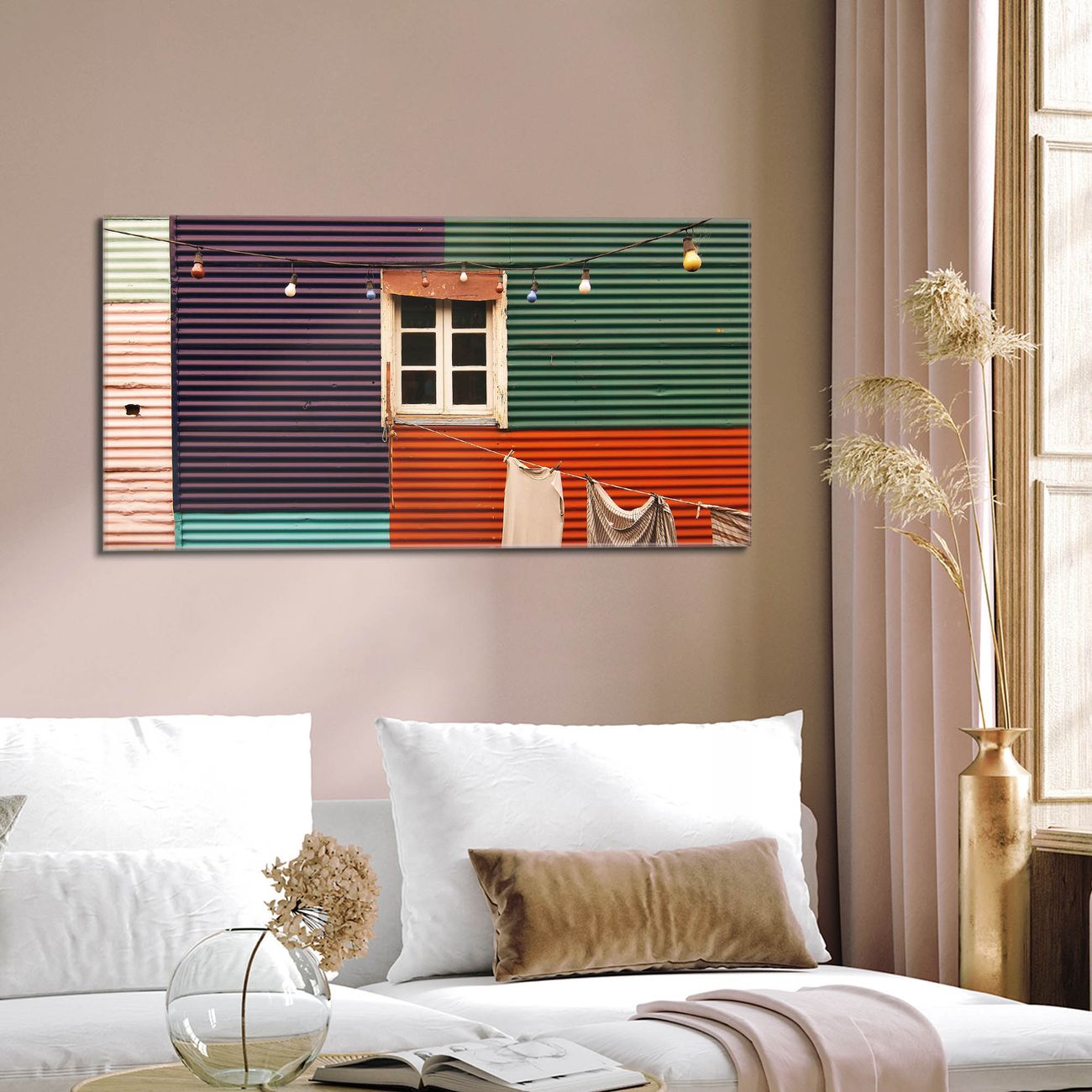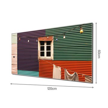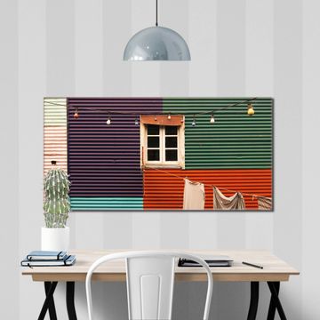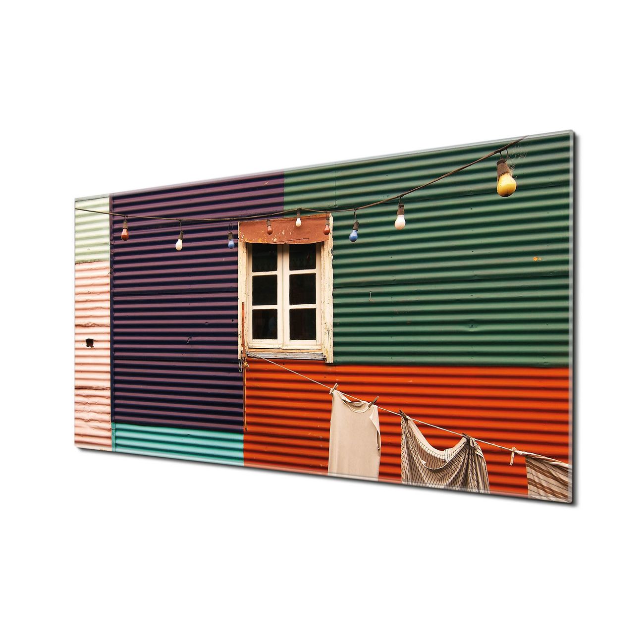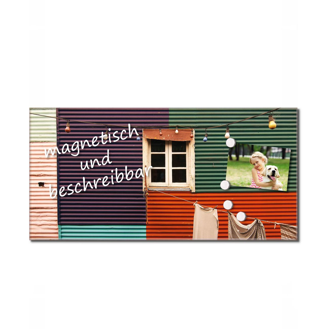 Material: 4mm Sicherheitsglas mit Metallrückwand Eigenschaften: beschreibbar, magnetisch, kratzfest Maße: 120x60x0,6cm, 10,80kg schwer Motiv Nummer 10655 Buntes Haus Zubehör: inklusive 4 Neodym-Magnete