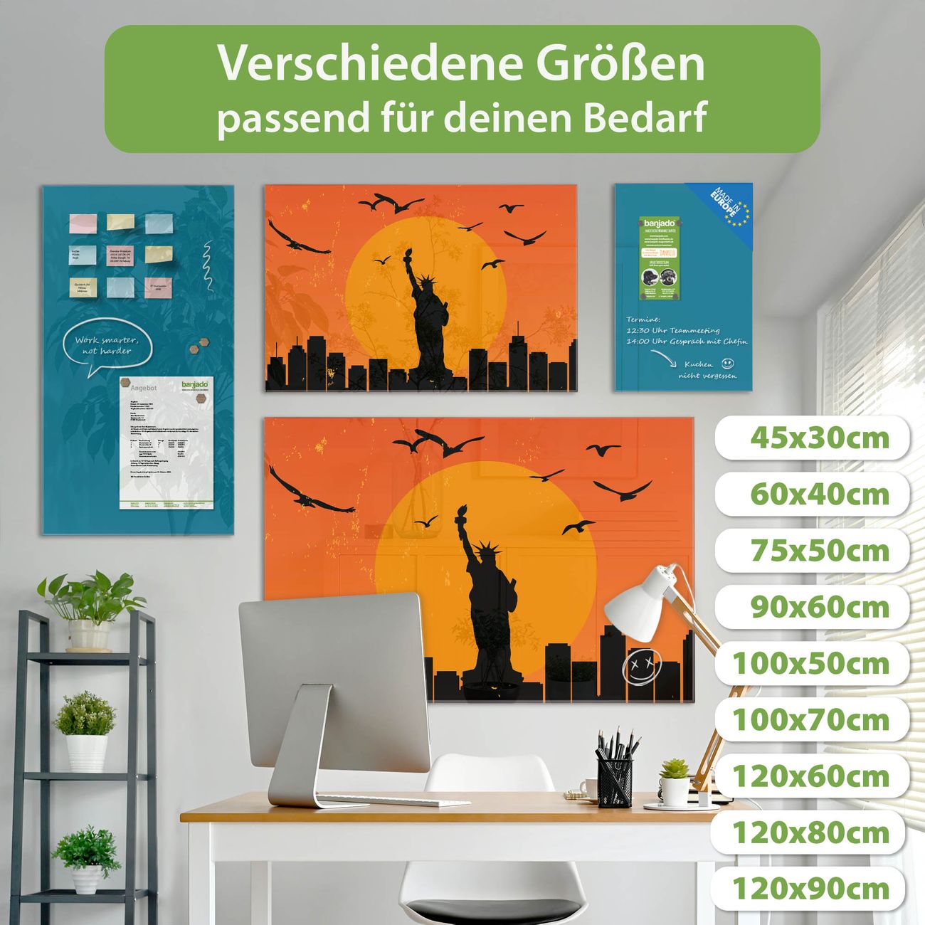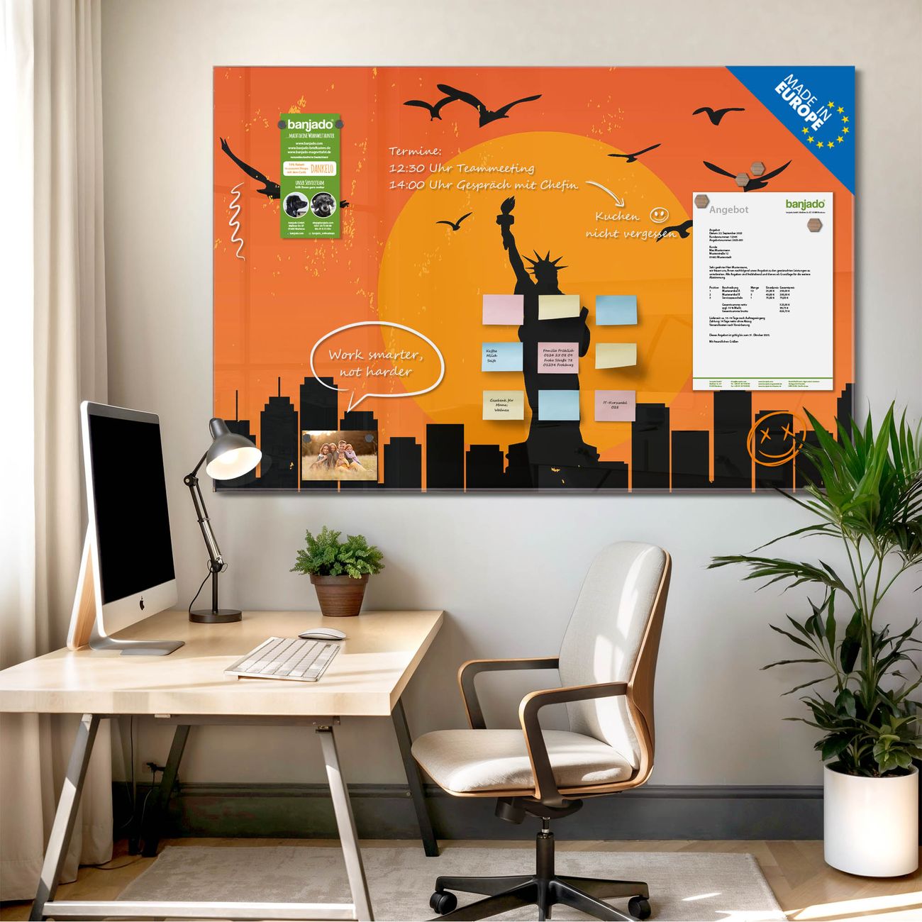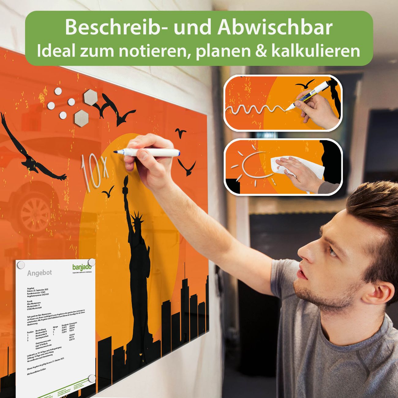 Jede Glas Magnettafel wird in unserer Werkstatt von Hand gefertigt und sorgfältig geprüft. So erhalten Sie ein echtes Qualitätsprodukt, das Funktion und Ästhetik perfekt vereint.?? Warum banjado?