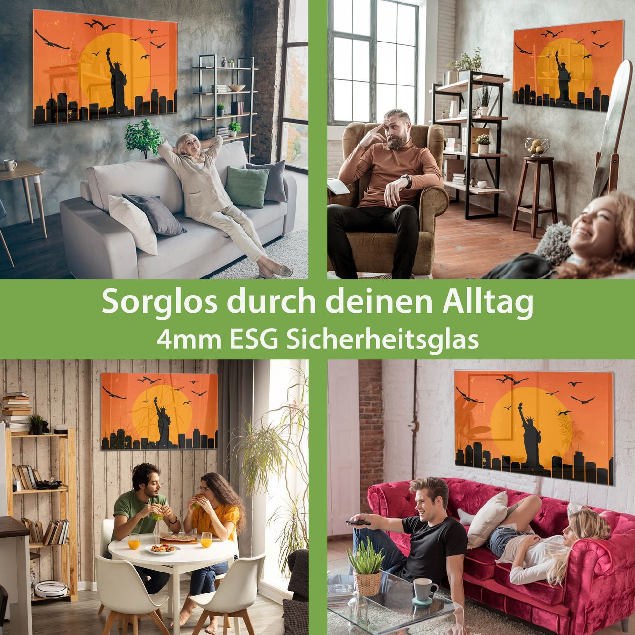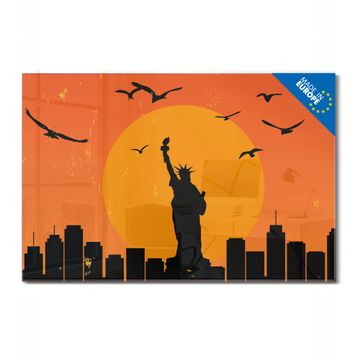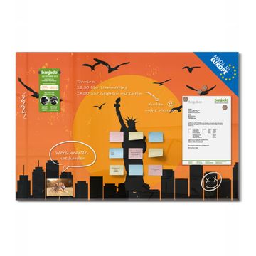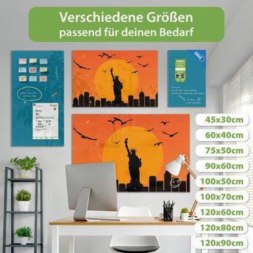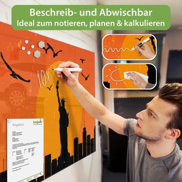 Material: 4mm Sicherheitsglas mit Metallrückwand Eigenschaften: beschreibbar, magnetisch, kratzfest Maße: 90x60x0,6cm, 8,10kg schwer Motiv Nummer 12982 City Poster New York Zubehör: inklusive 4 Neodym-Magnete