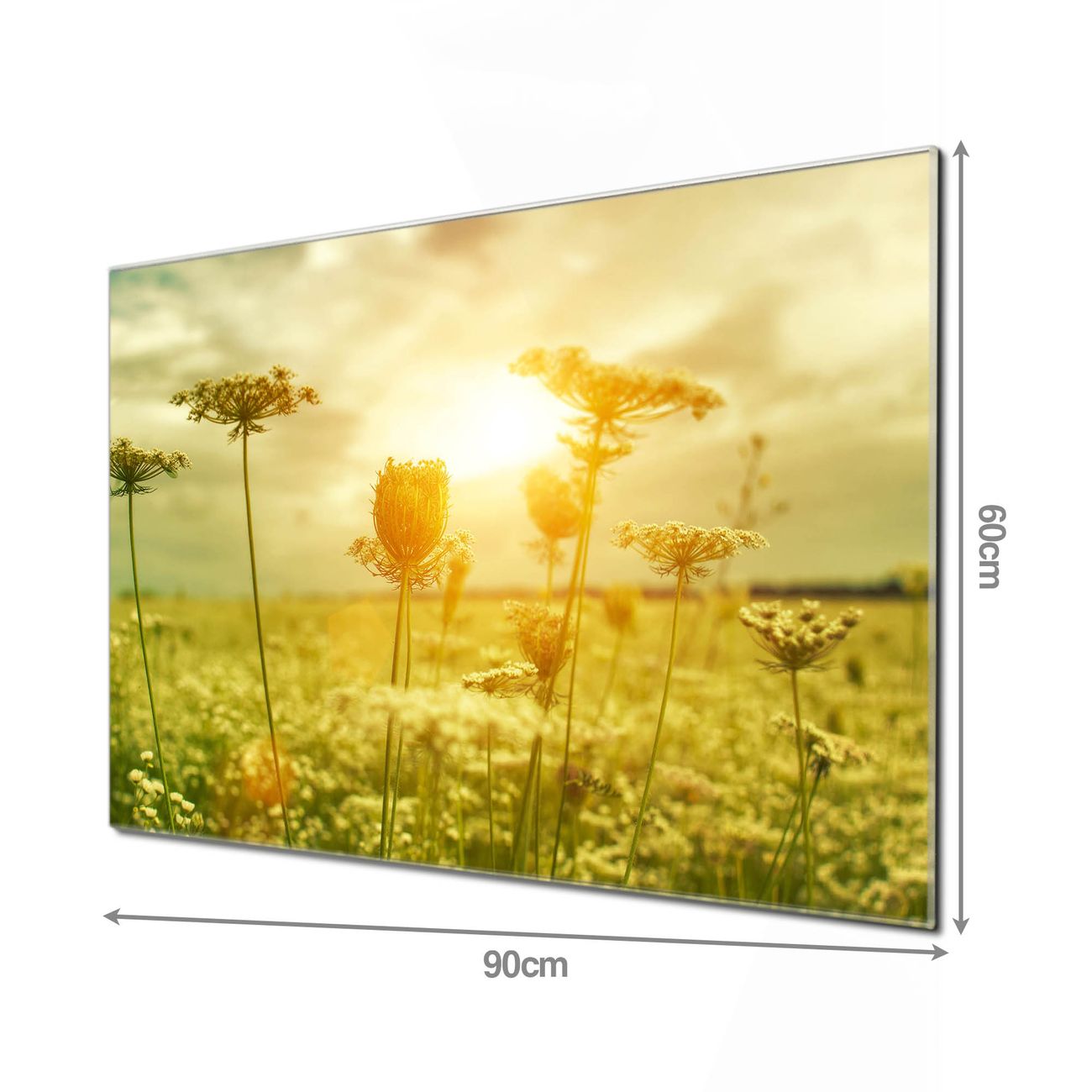 Material: 4mm Sicherheitsglas mit Metallrückwand Eigenschaften: beschreibbar, magnetisch, kratzfest Maße: 90x60x0,6cm, 8,10kg schwer Motiv Nummer 12914 Dill im Sonnenlicht Zubehör: inklusive 4 Neodym-Magnete