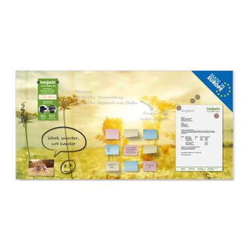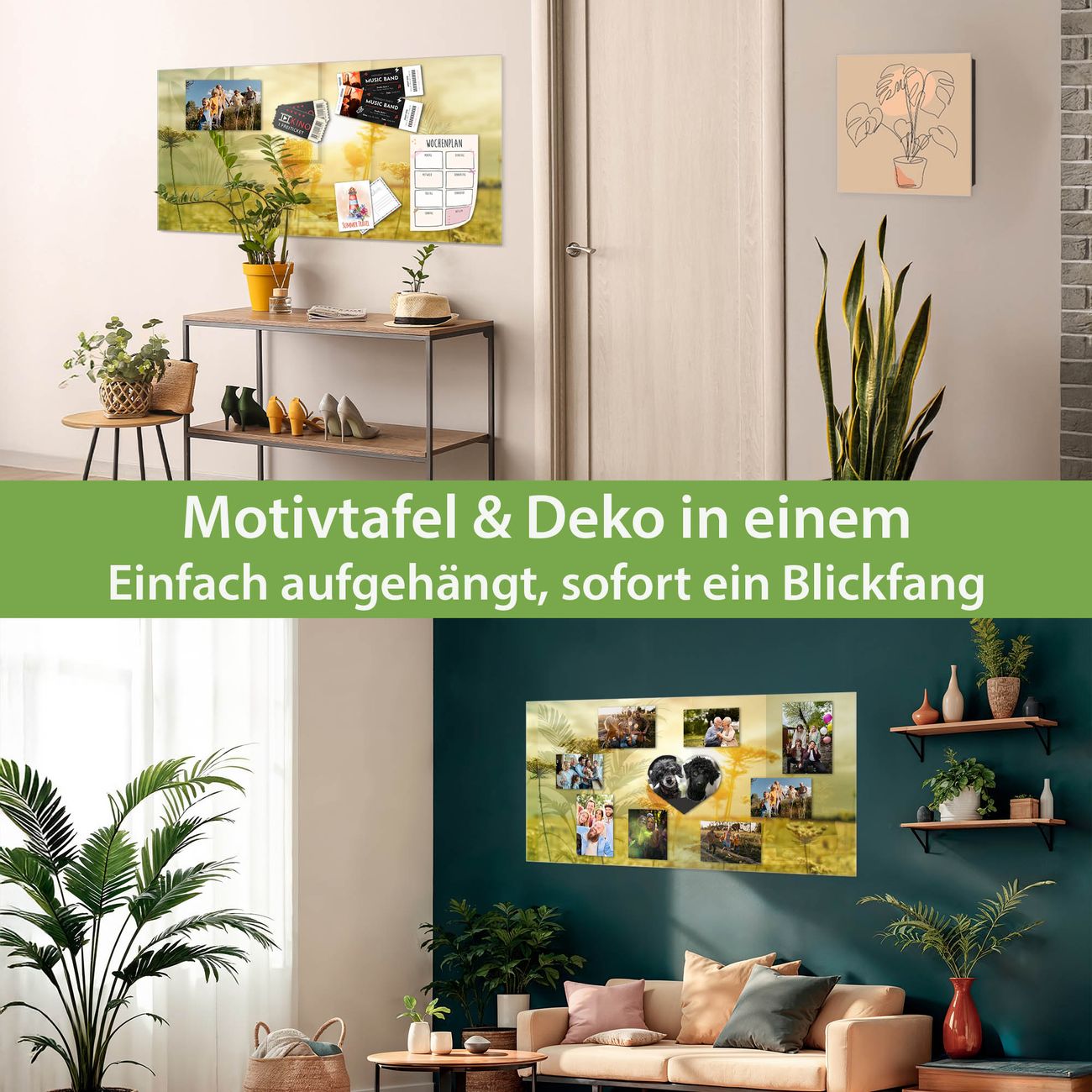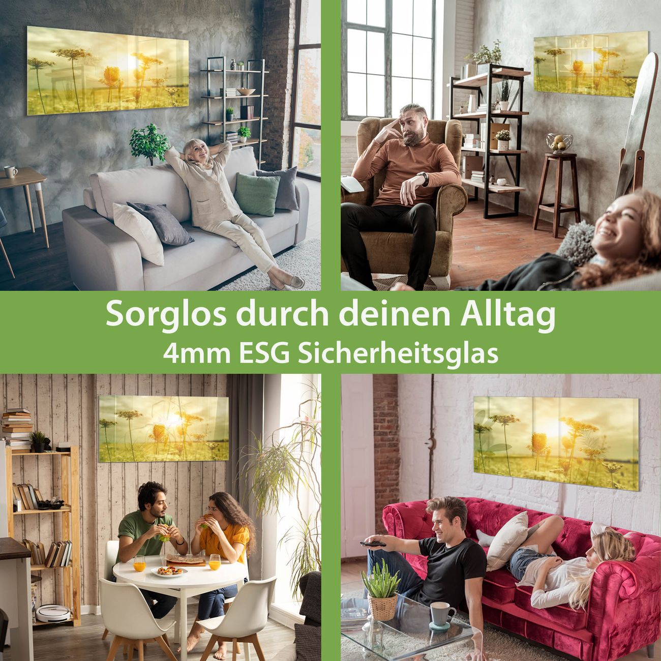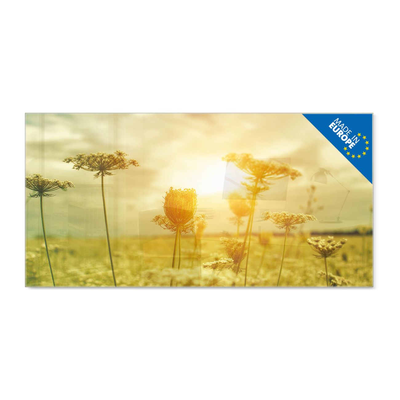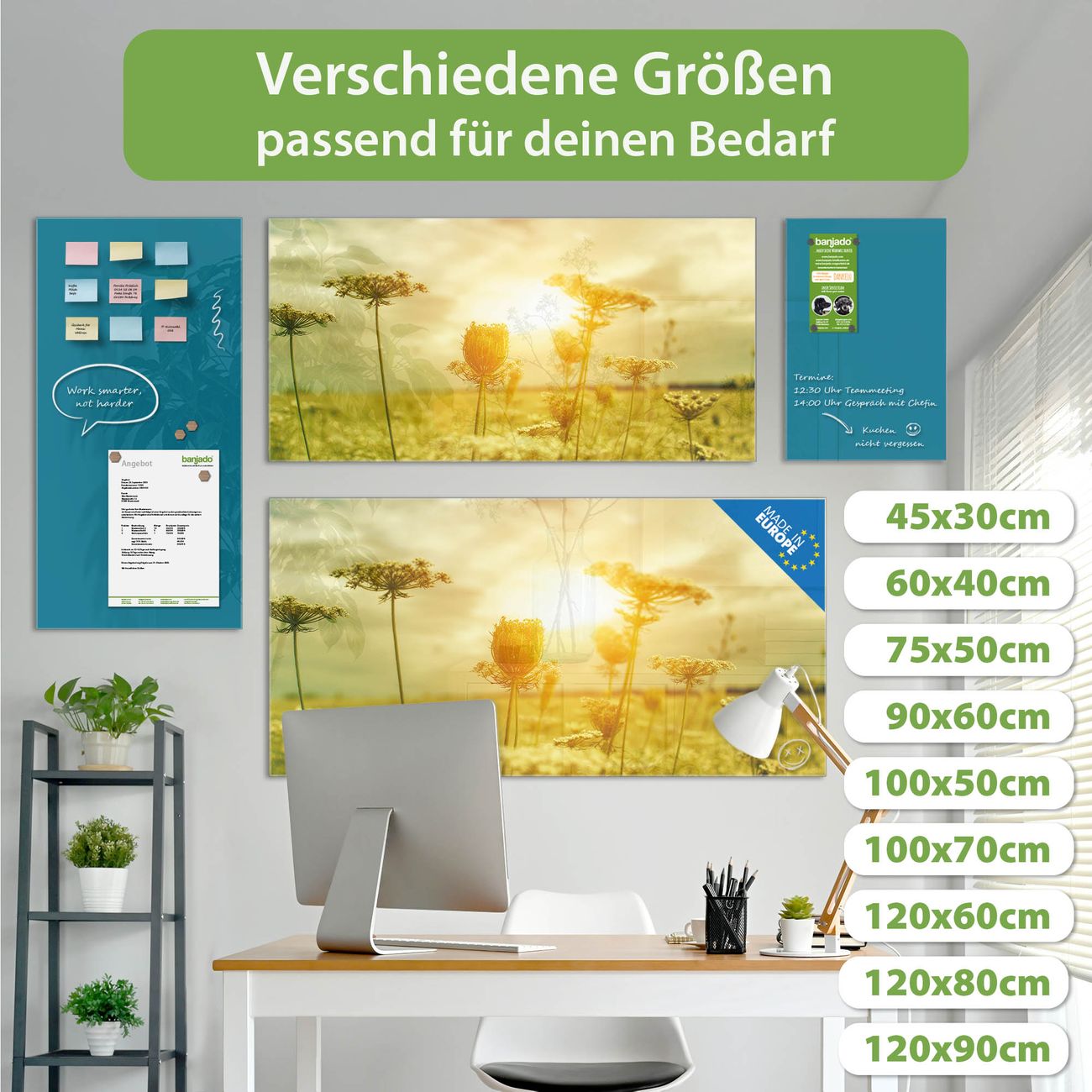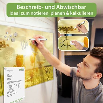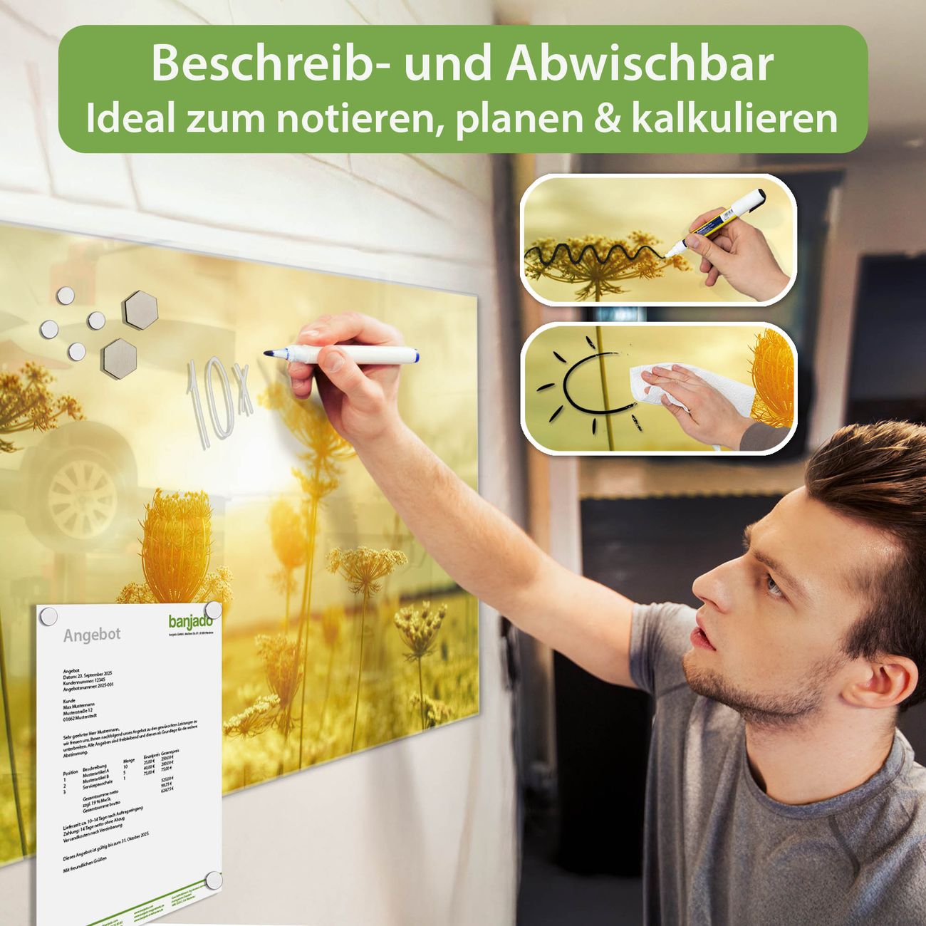 Material: 4mm Sicherheitsglas mit Metallrückwand Eigenschaften: beschreibbar, magnetisch, kratzfest Maße: 120x60x0,6cm, 10,80kg schwer Motiv Nummer 12914 Dill im Sonnenlicht Zubehör: inklusive 4 Neodym-Magnete