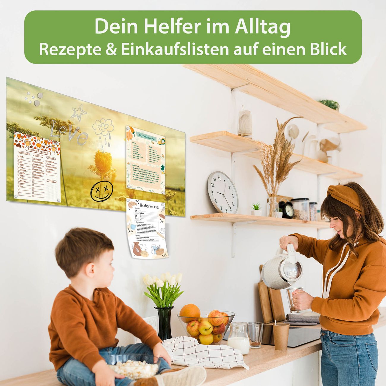 Auf der glatten Glasoberfläche lassen sich Termine, Rezepte oder Notizen ganz einfach mit Kreidestiften festhalten und rückstandslos entfernen. Starke Neodym-Magnete halten Ihre wichtigsten Erinnerungen sicher an Ort und Stelle. So entsteht Ihre ganz persönliche Ideenwand - jeden Tag neu.
