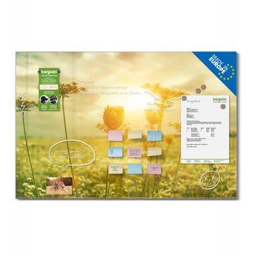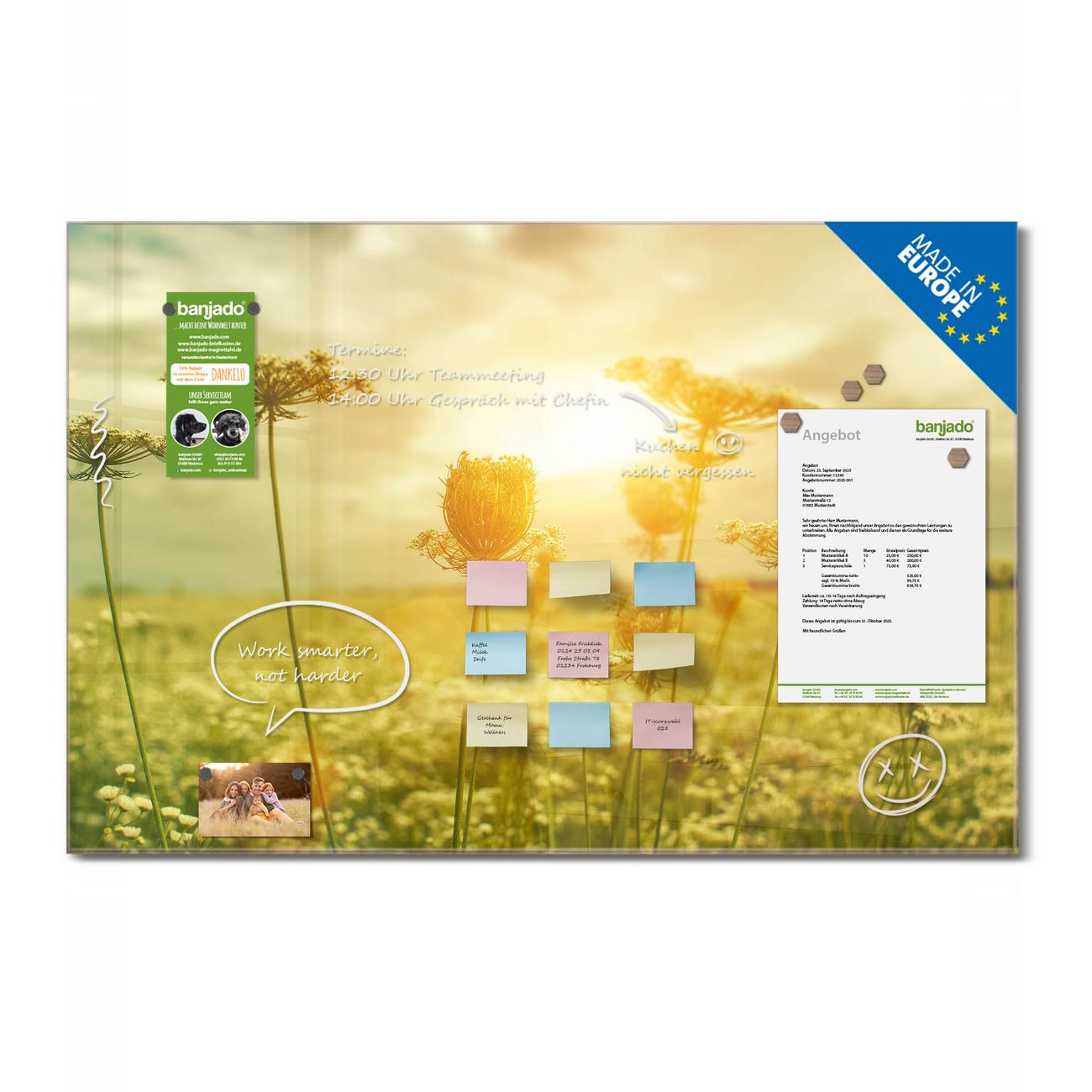 Material: 4mm Sicherheitsglas mit Metallrückwand Eigenschaften: beschreibbar, magnetisch, kratzfest Maße: 120x80x0,6cm, 14,40kg schwer Motiv Nummer 12914 Dill im Sonnenlicht Zubehör: inklusive 4 Neodym-Magnete