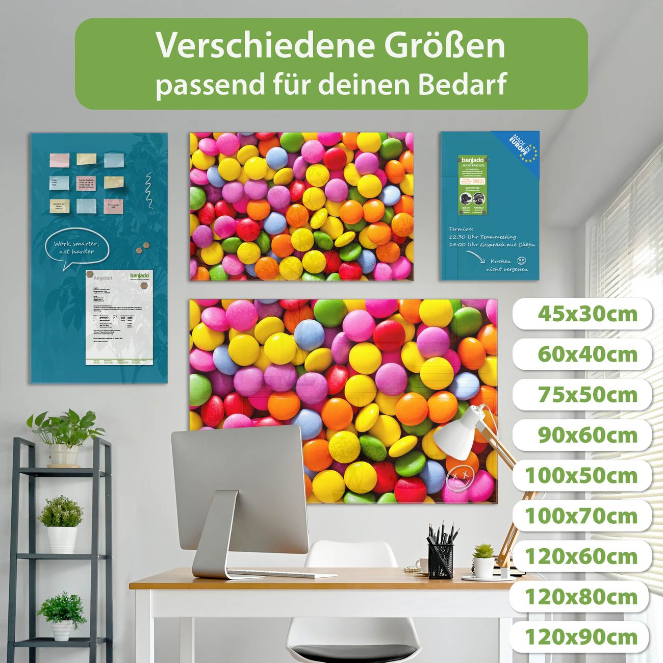 Material: 4mm Sicherheitsglas mit Metallrückwand Eigenschaften: beschreibbar, magnetisch, kratzfest Maße: 120x80x0,6cm, 14,40kg schwer Motiv Nummer 12075 Dragees Zubehör: inklusive 4 Neodym-Magnete
