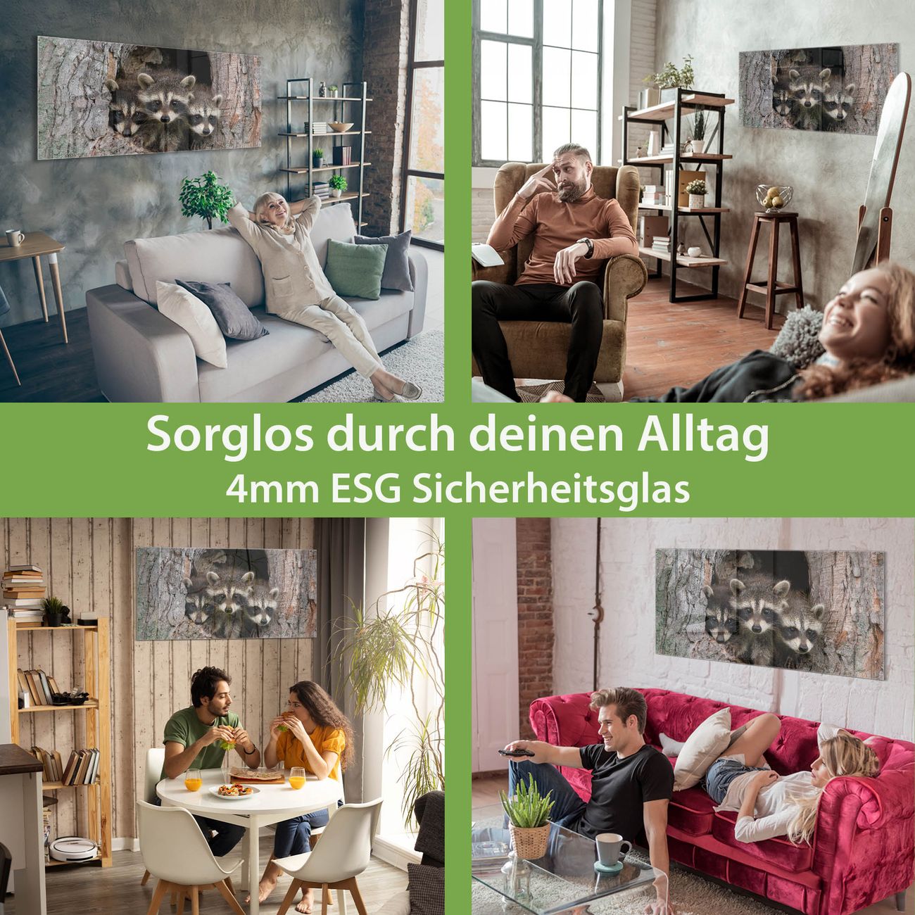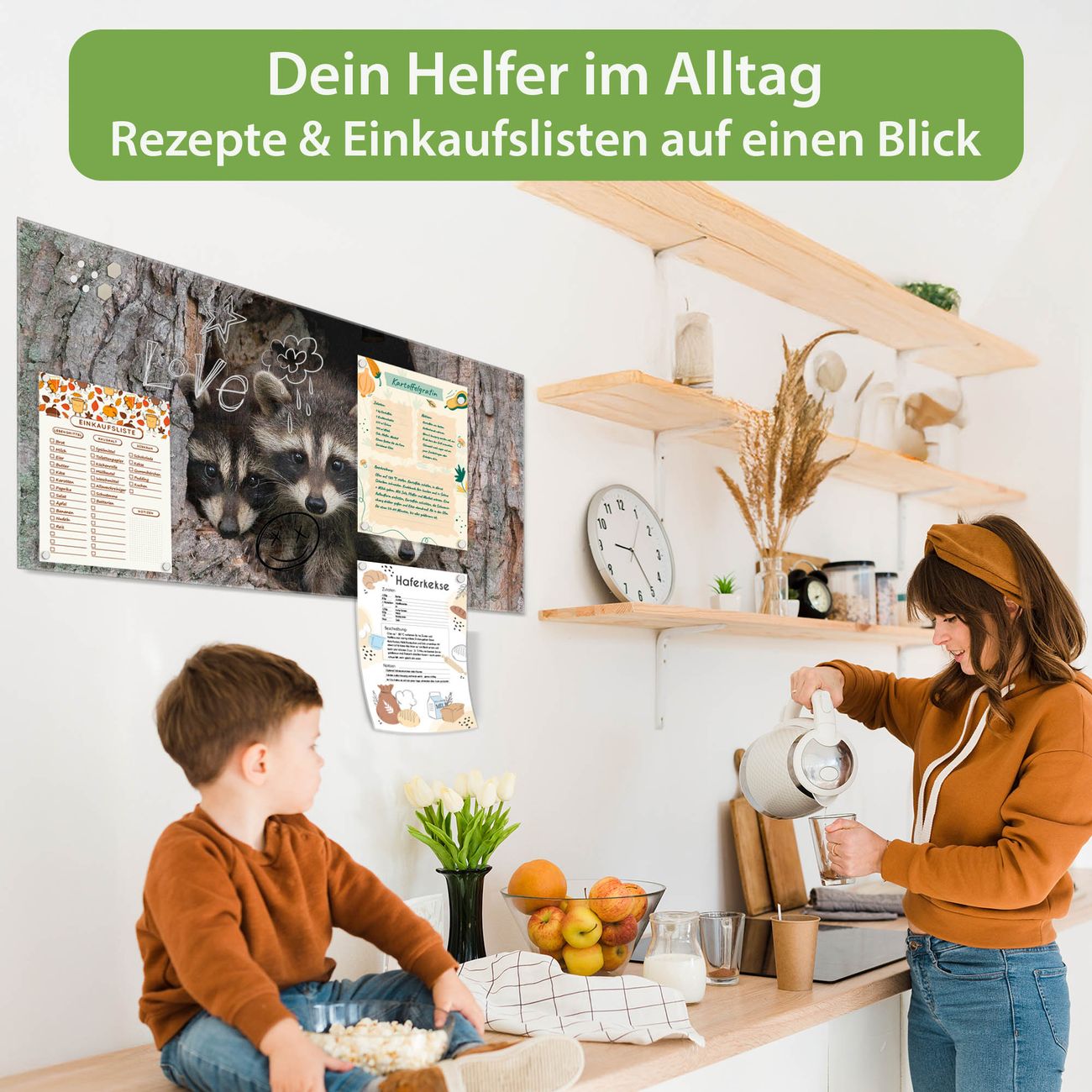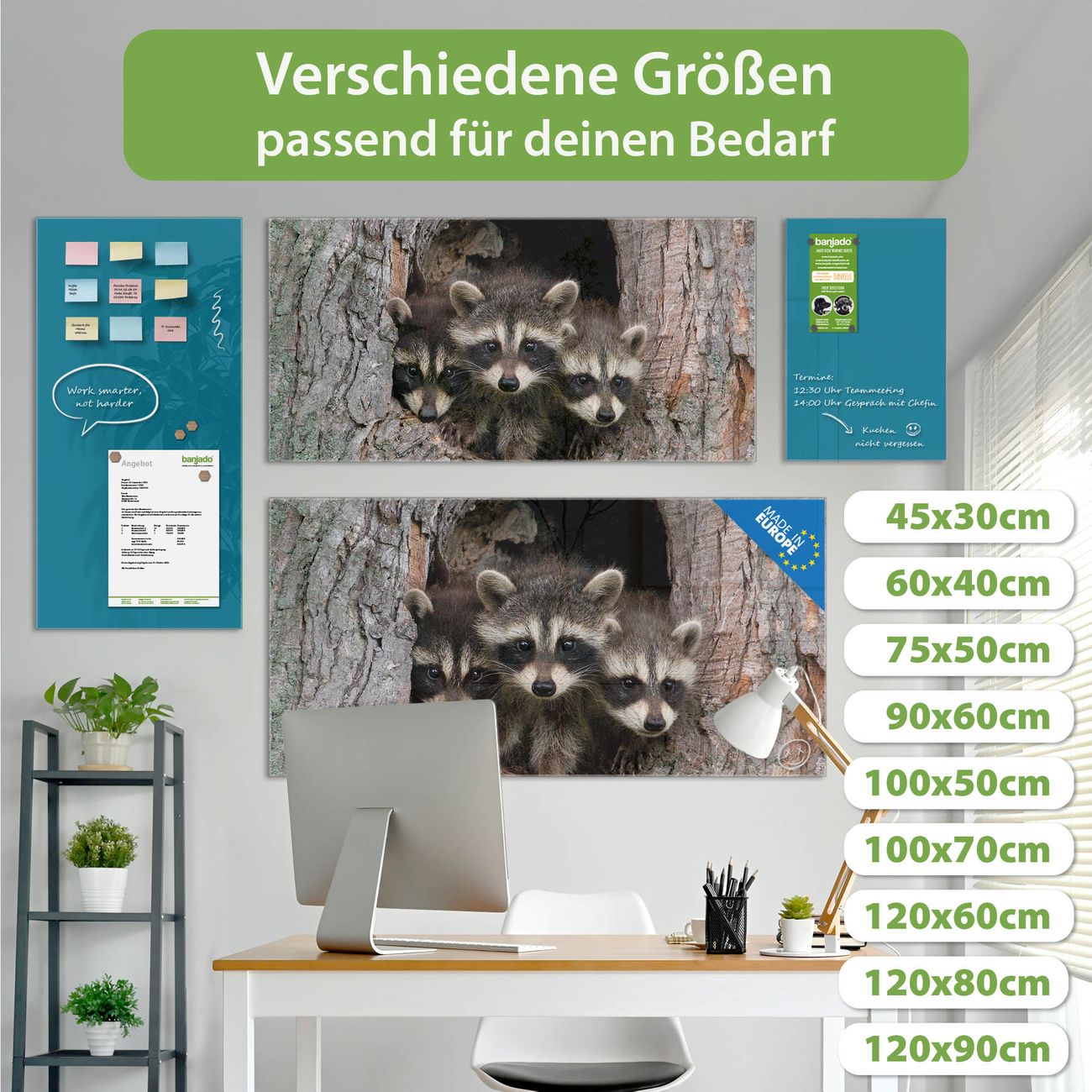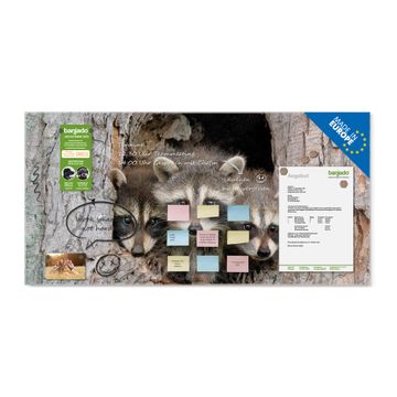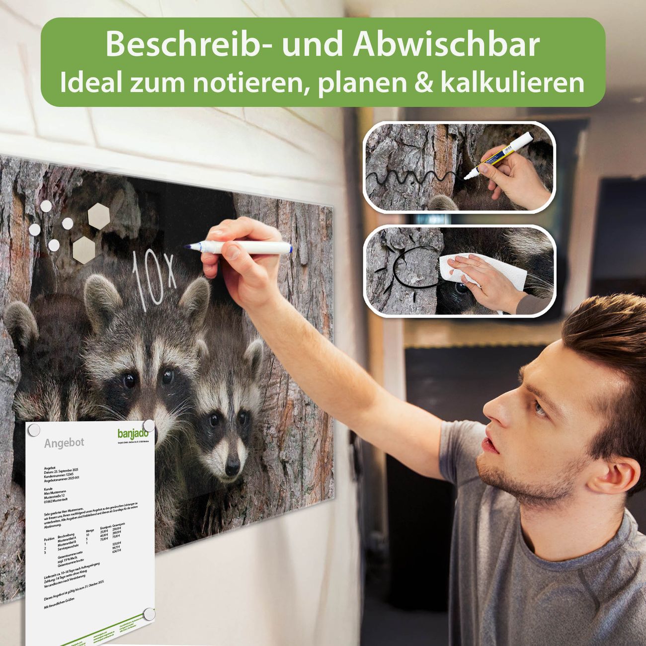 Material: 4mm Sicherheitsglas mit Metallrückwand Eigenschaften: beschreibbar, magnetisch, kratzfest Maße: 120x60x0,6cm, 10,80kg schwer Motiv Nummer 12804 Drei Waschbären Zubehör: inklusive 4 Neodym-Magnete