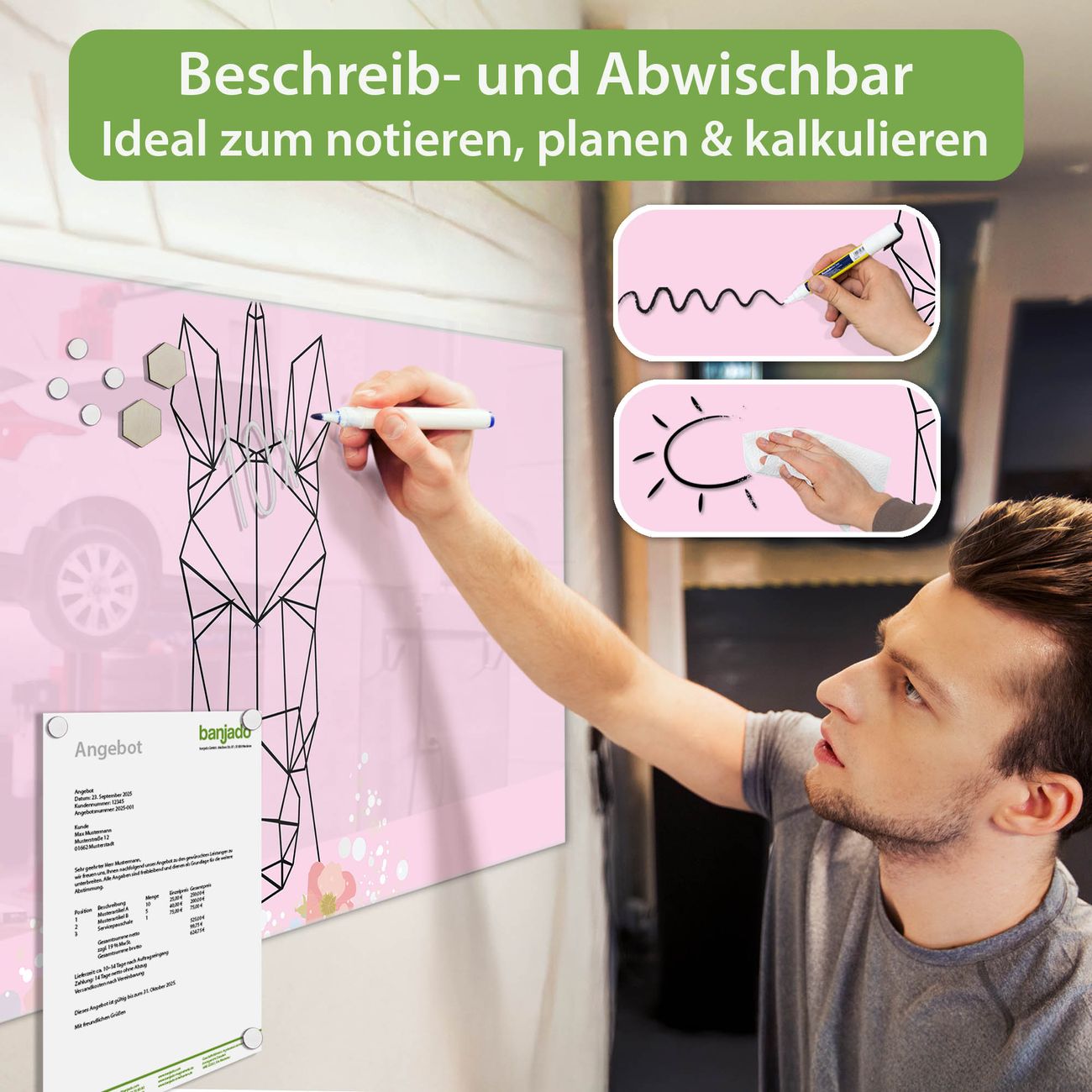 Bitte beachten Sie, dass ausschliessliche spezielle Magnete an der Glastafel haften. Wir empfehlen banjado Neodym Magnete, diese sind durch uns auf Wirksamkeit geprüft.