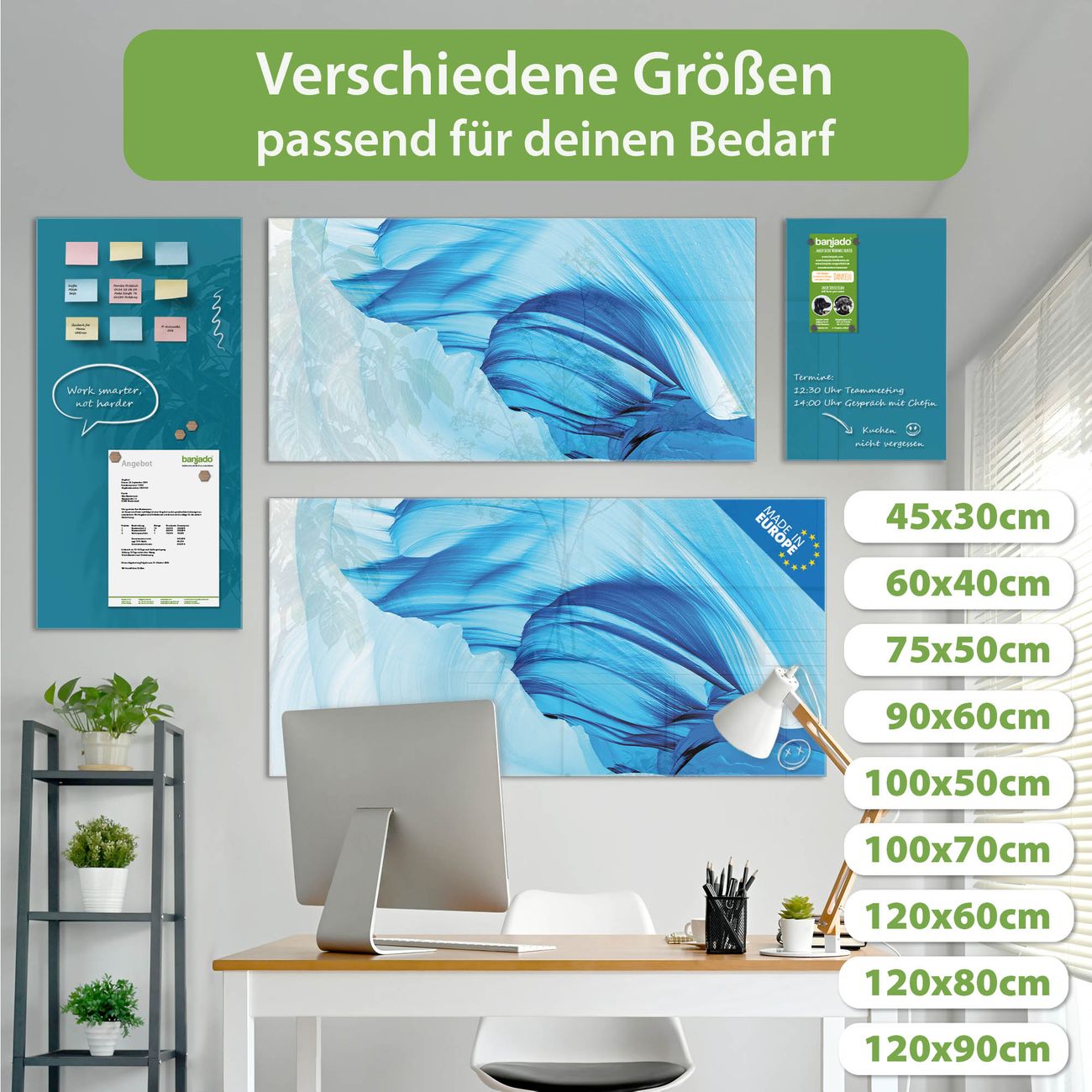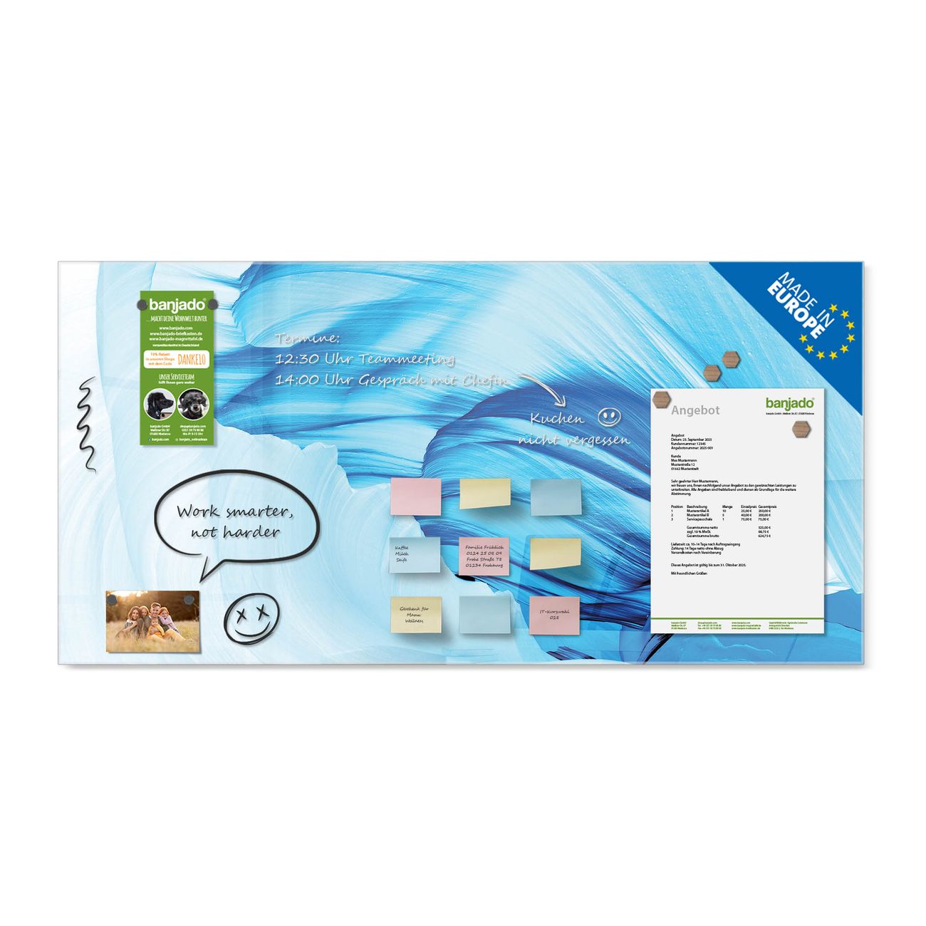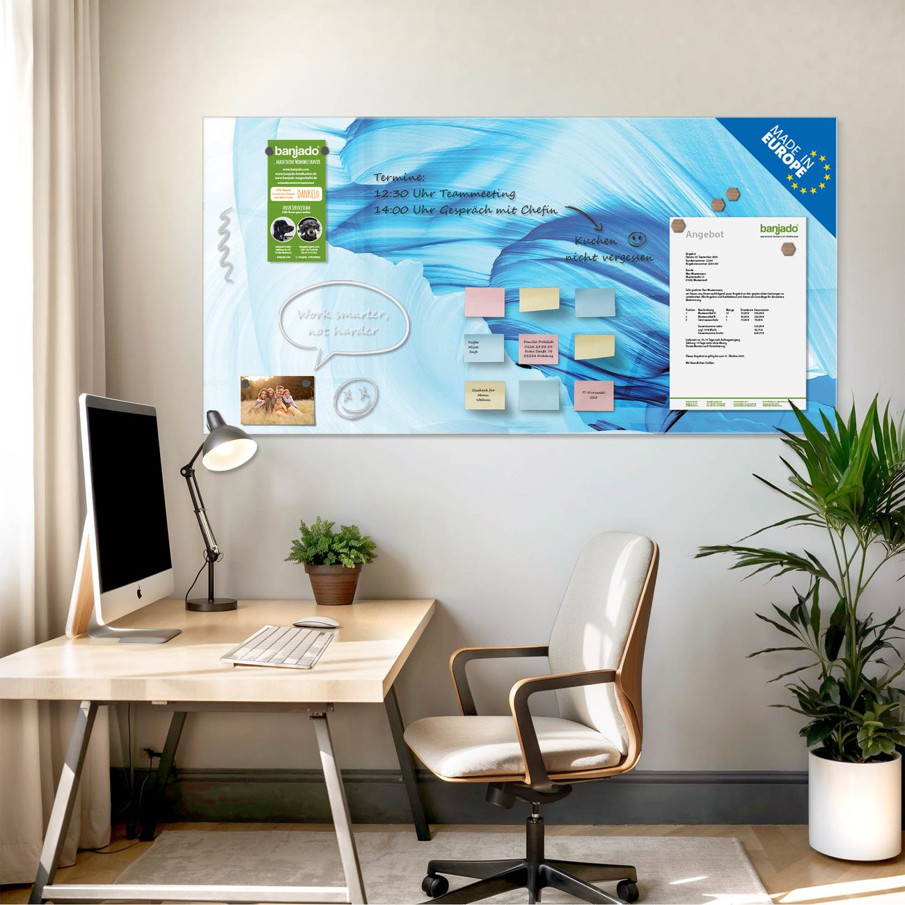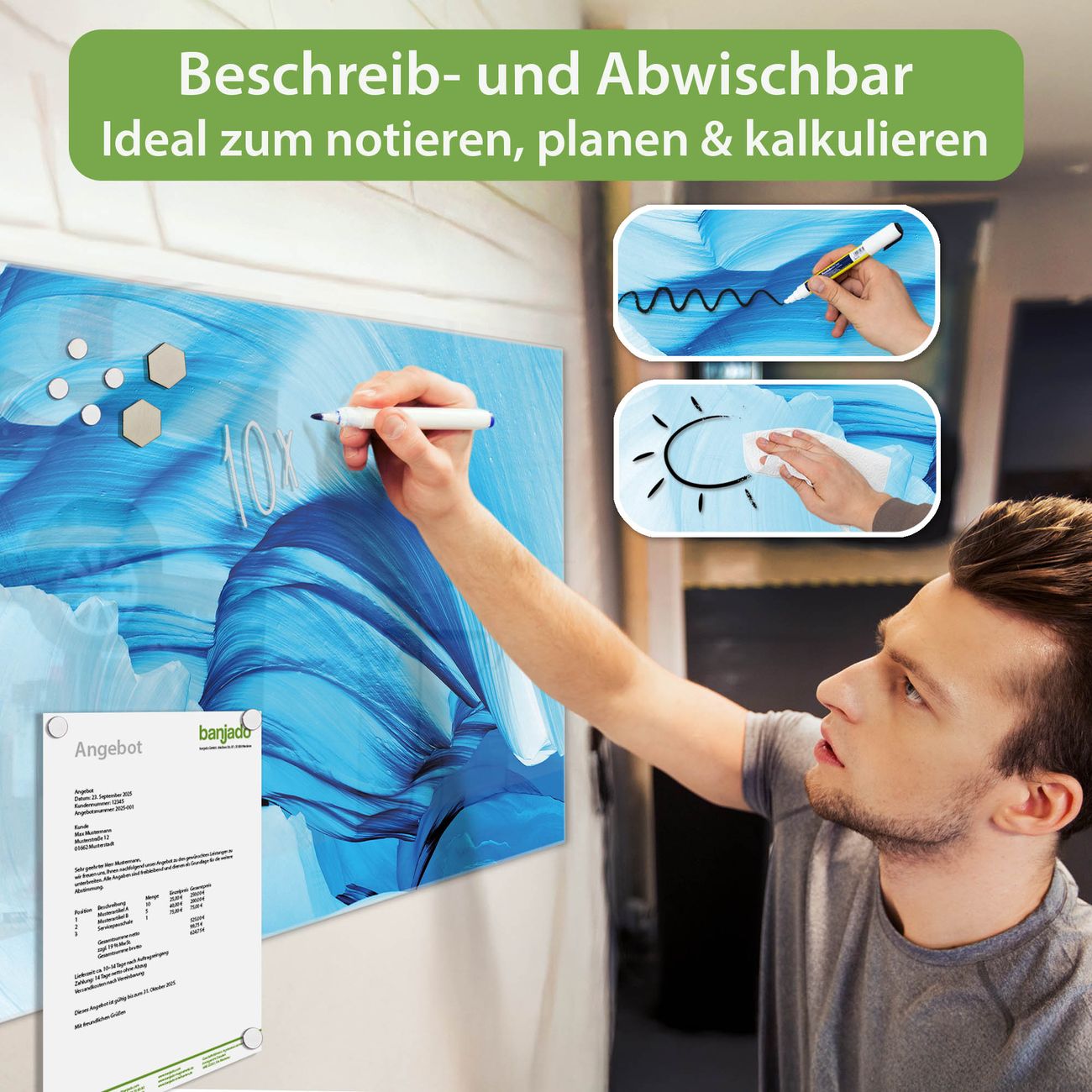 Jede Glas Magnettafel wird in unserer Werkstatt von Hand gefertigt und sorgfältig geprüft. So erhalten Sie ein echtes Qualitätsprodukt, das Funktion und Ästhetik perfekt vereint.?? Warum banjado?
