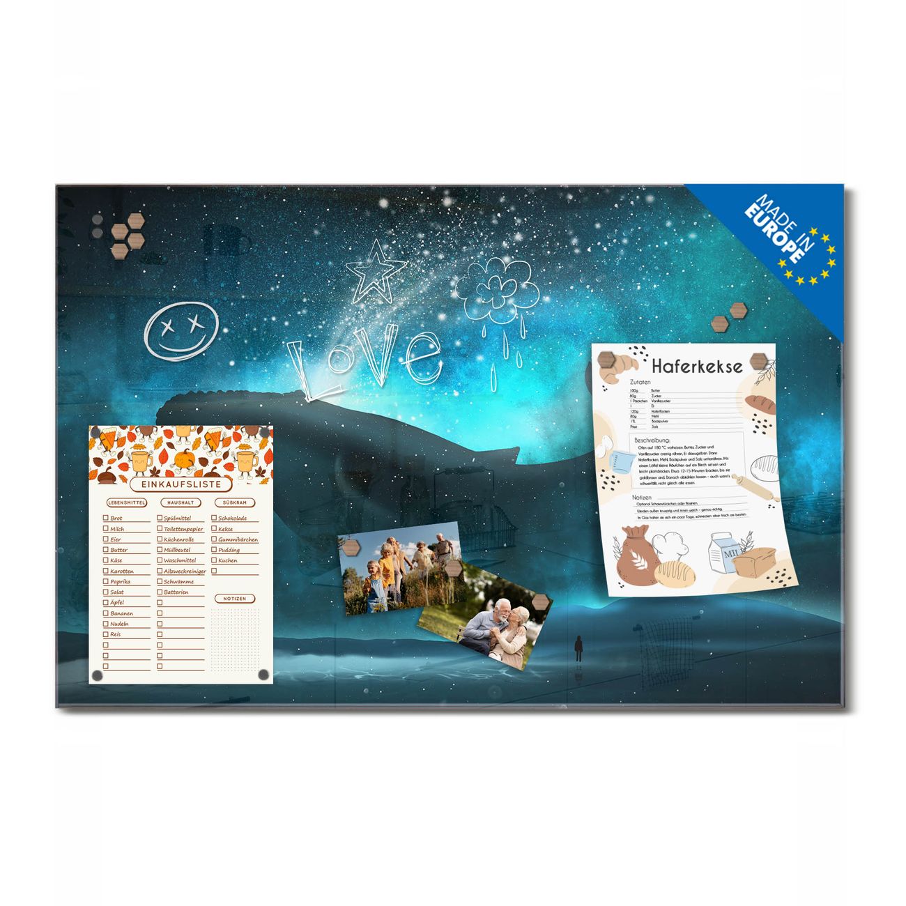 Ein Stück Design, das Ihren Alltag organisiert. Schreiben, heften, inspirieren - alles an einem Ort. Qualität, die man spürt. Montage leicht gemacht. Handwerk mit Herz - veredelt in Sachsen. Einzigartiges Design mit Motiv Motiv fliegender Wal Beschreibbare Glasoberfläche, leicht zu reinigen Starke Magnetkraft durch Stahlrückwand Inklusive 4 Neodym-Magneten Flexible Montageoptionen Handveredelt in Sachsen - Qualität, die bleibt