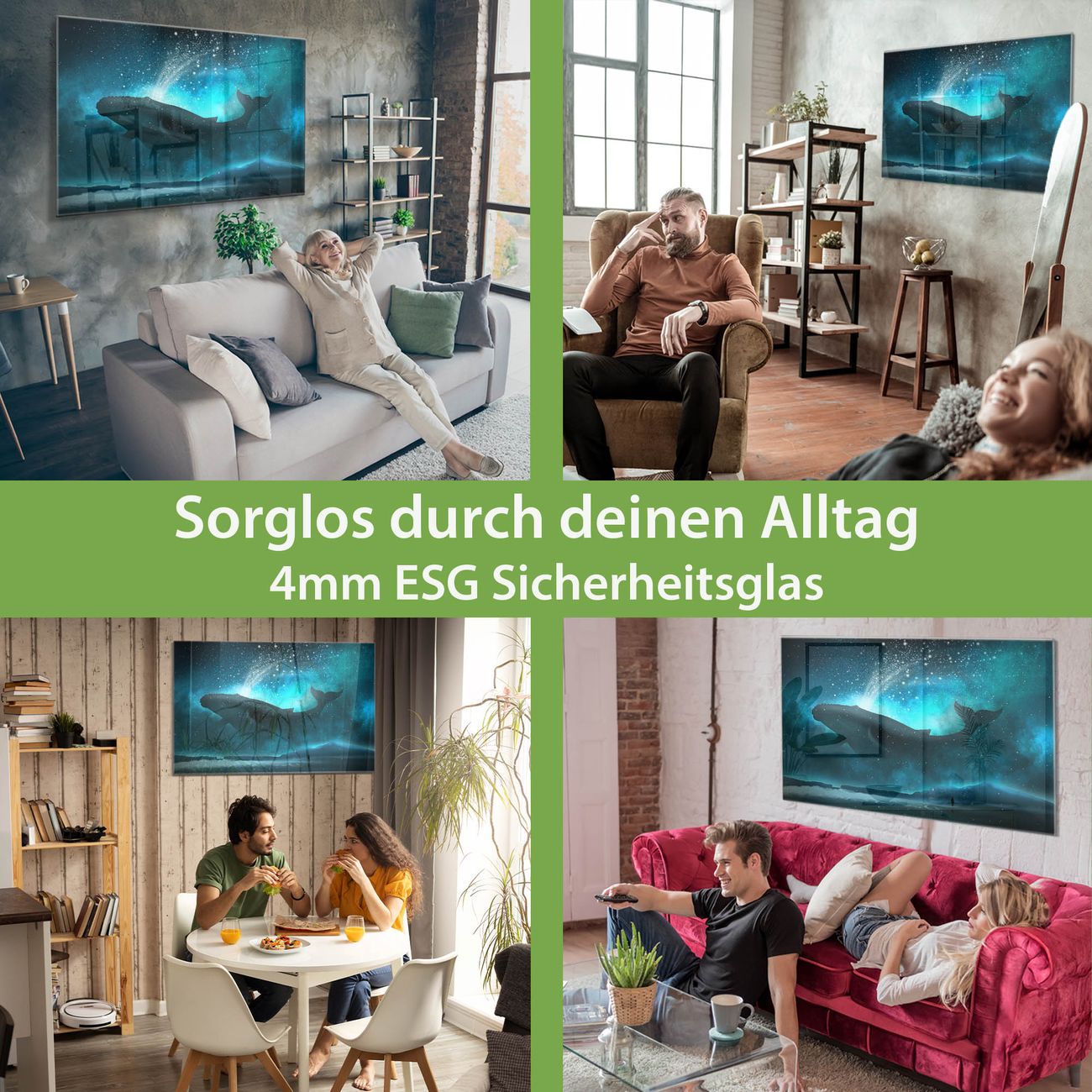 Material: 4mm Sicherheitsglas mit Metallrückwand Eigenschaften: beschreibbar, magnetisch, kratzfest Maße: 75x50x0,6cm, 5,63kg schwer Motiv Nummer 12855 fliegender Wal Zubehör: inklusive 4 Neodym-Magnete