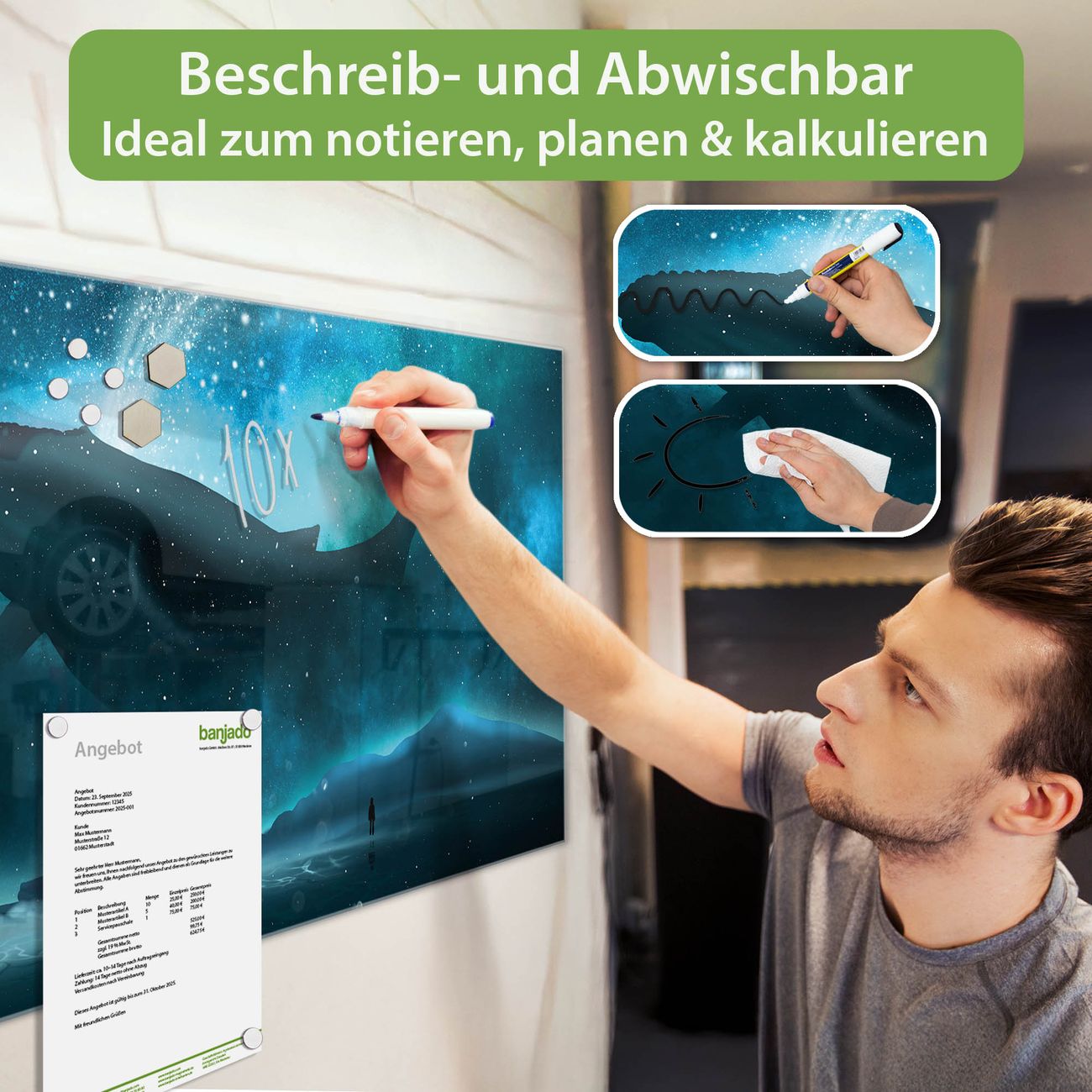 Jede Glas Magnettafel wird in unserer Werkstatt von Hand gefertigt und sorgfältig geprüft. So erhalten Sie ein echtes Qualitätsprodukt, das Funktion und Ästhetik perfekt vereint.?? Warum banjado?