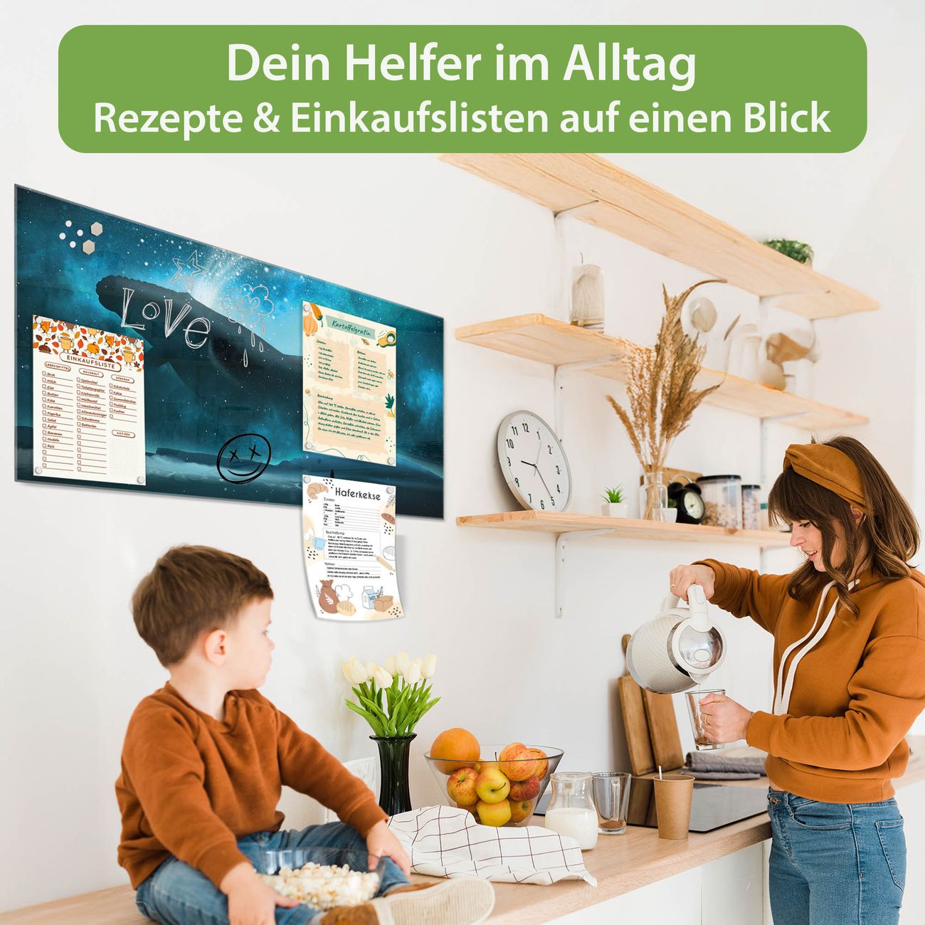 Auf der glatten Glasoberfläche lassen sich Termine, Rezepte oder Notizen ganz einfach mit Kreidestiften festhalten und rückstandslos entfernen. Starke Neodym-Magnete halten Ihre wichtigsten Erinnerungen sicher an Ort und Stelle. So entsteht Ihre ganz persönliche Ideenwand - jeden Tag neu.