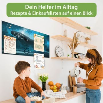 Material: 4mm Sicherheitsglas mit Metallrückwand Eigenschaften: beschreibbar, magnetisch, kratzfest Maße: 120x60x0,6cm, 10,80kg schwer Motiv Nummer 12855 fliegender Wal Zubehör: inklusive 4 Neodym-Magnete