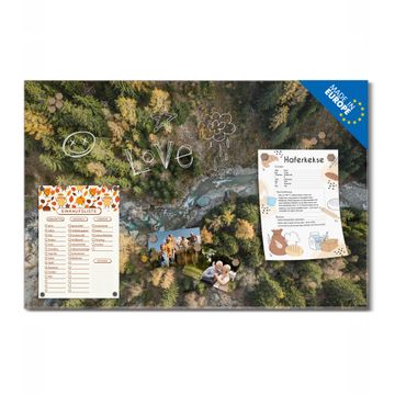 Material: 4mm Sicherheitsglas mit Metallrückwand Eigenschaften: beschreibbar, magnetisch, kratzfest Maße: 100x50x0,6cm, 7,50kg schwer Motiv Nummer 12871 Fluss im Tal 2 Zubehör: inklusive 4 Neodym-Magnete