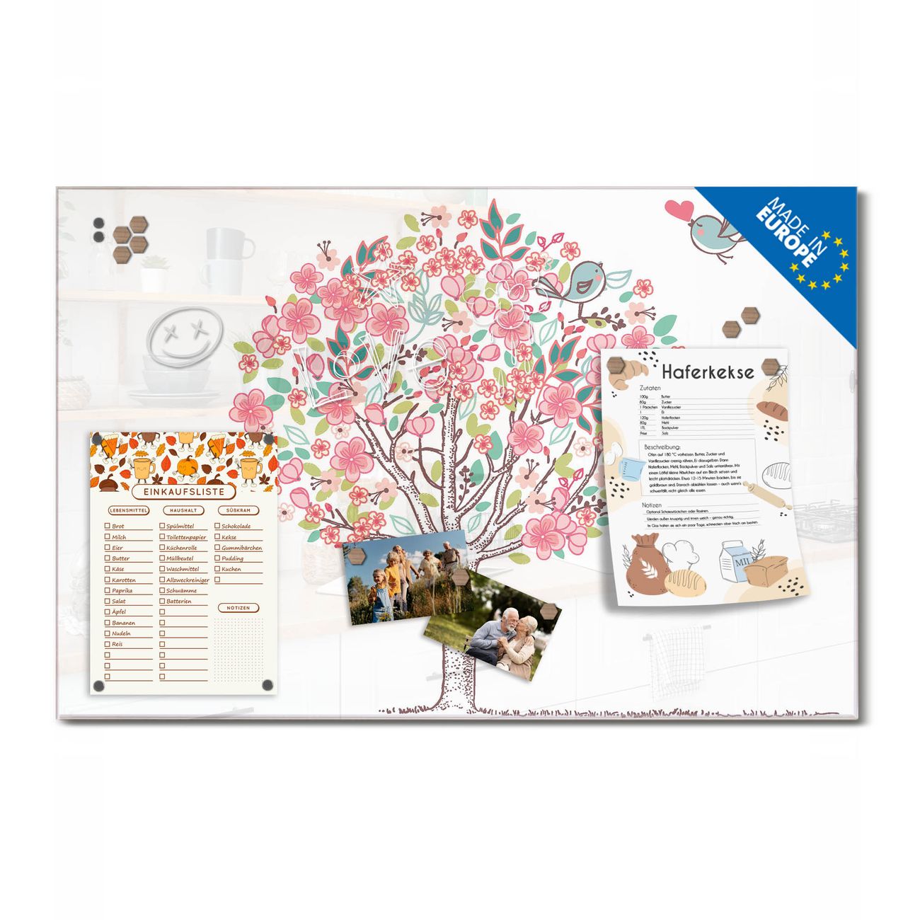 Material: 4mm Sicherheitsglas mit Metallrückwand Eigenschaften: beschreibbar, magnetisch, kratzfest Maße: 120x80x0,6cm, 14,40kg schwer Motiv Nummer 12035 Frühlingsgefühle Zubehör: inklusive 4 Neodym-Magnete
