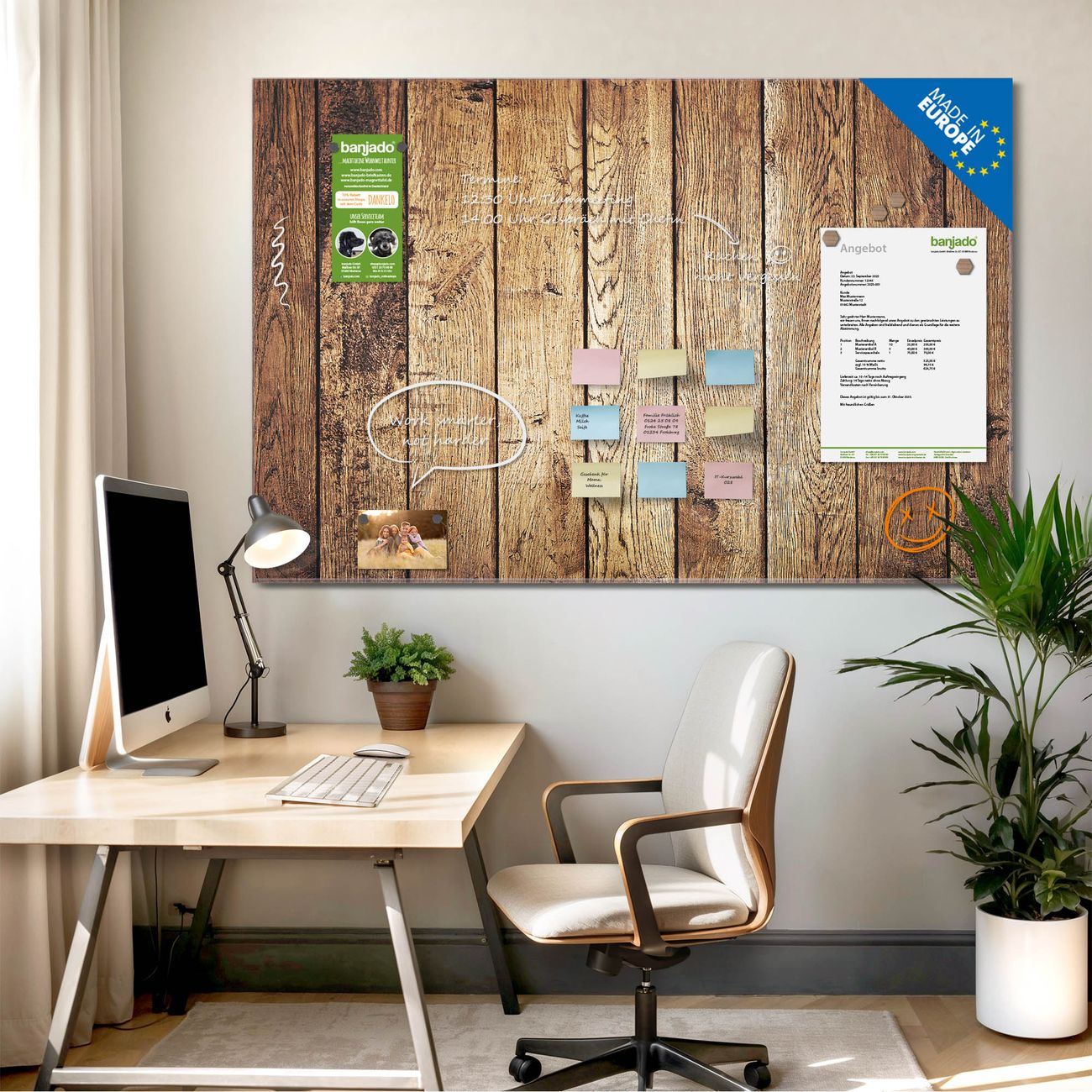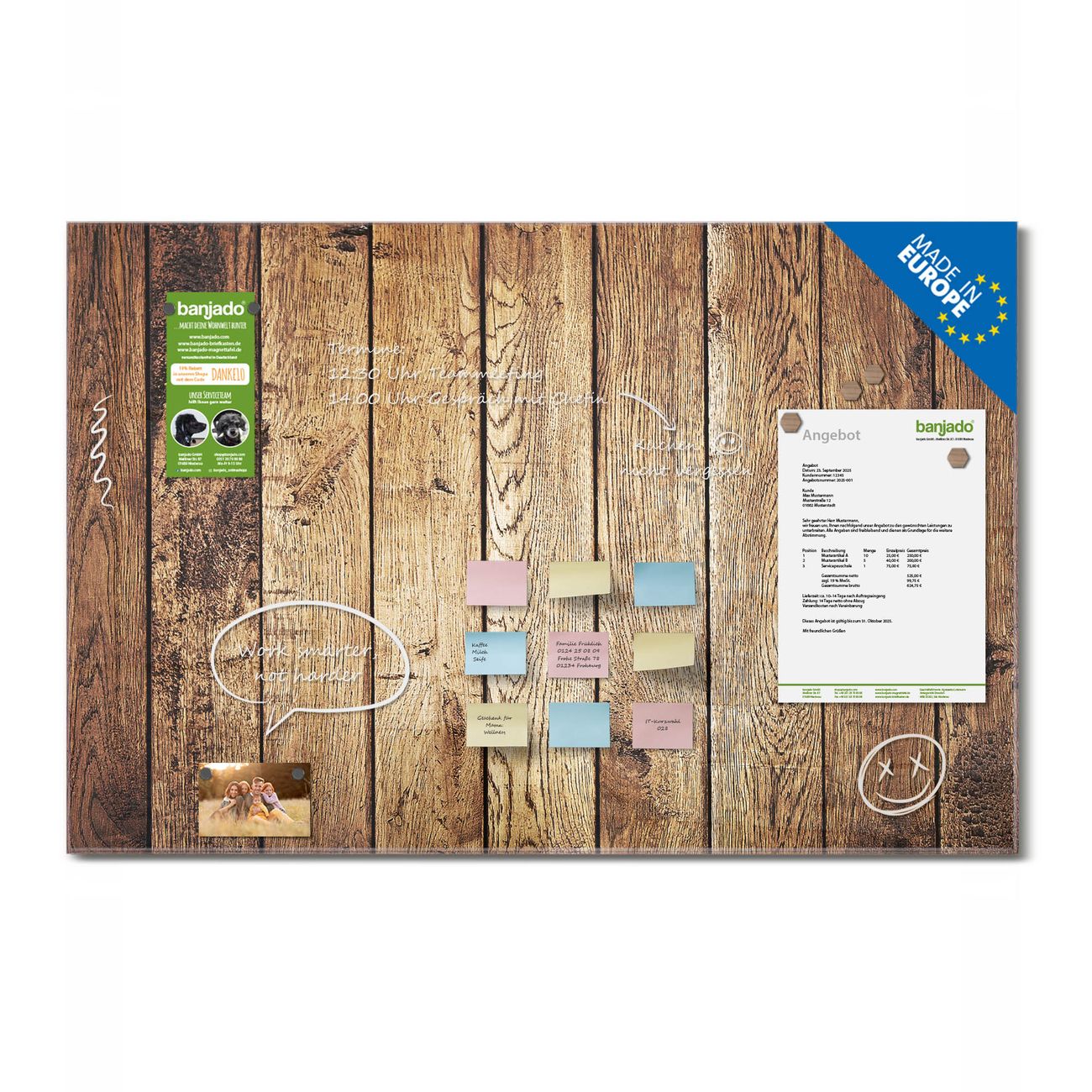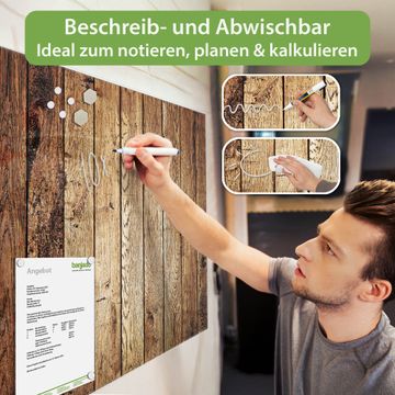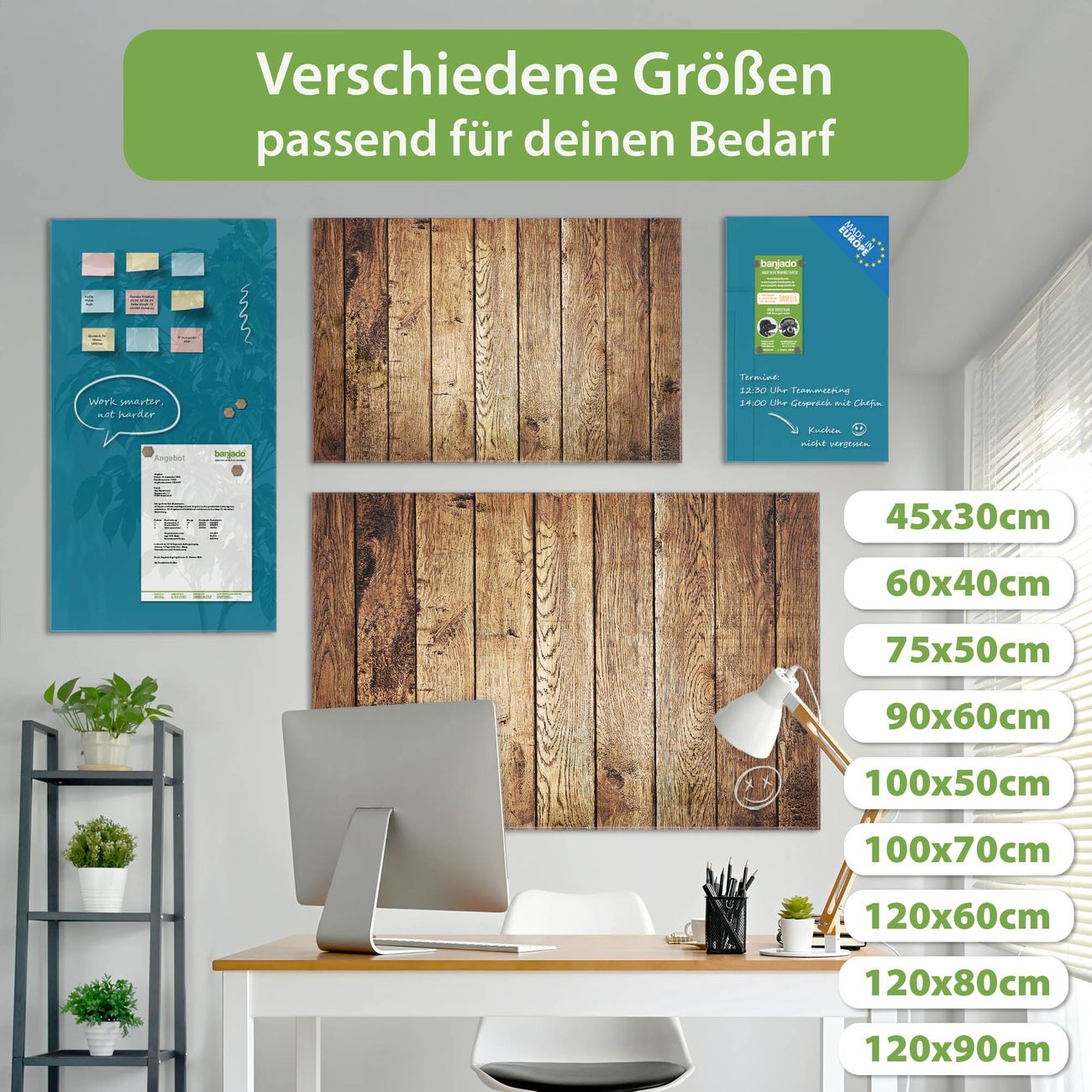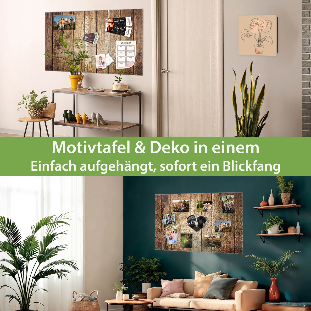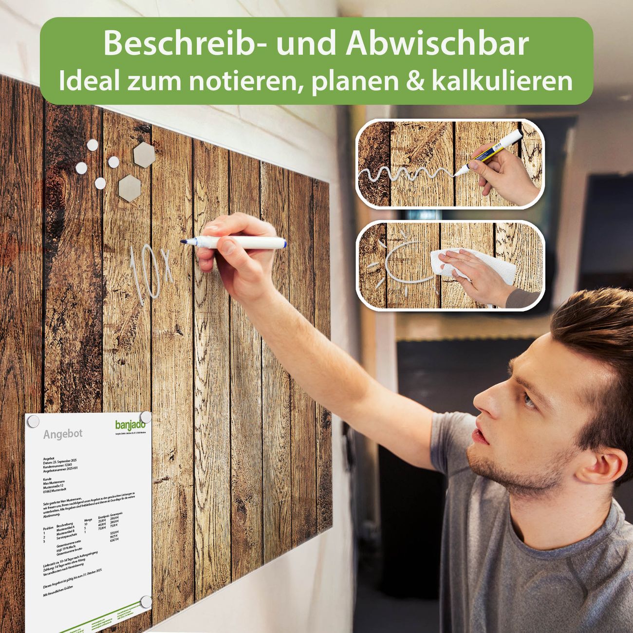 Material: 4mm Sicherheitsglas mit Metallrückwand Eigenschaften: beschreibbar, magnetisch, kratzfest Maße: 120x80x0,6cm, 14,40kg schwer Motiv Nummer 12153 Geöltes Holz Zubehör: inklusive 4 Neodym-Magnete