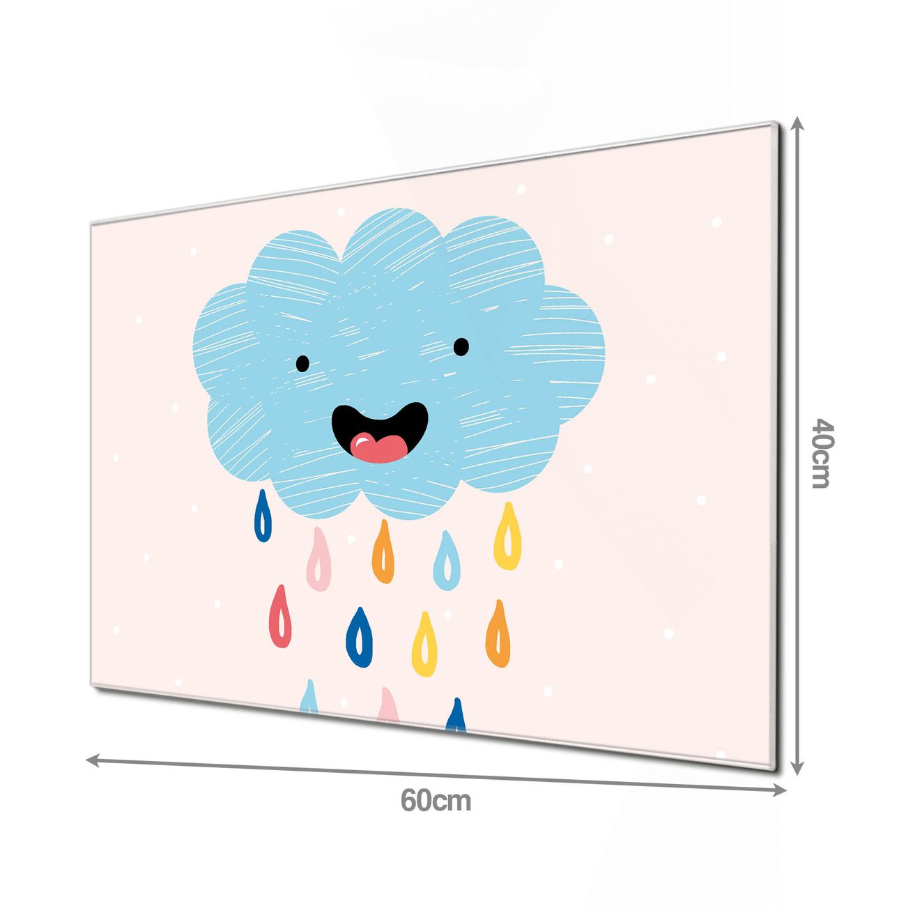 Material: 4mm Sicherheitsglas mit Metallrückwand Eigenschaften: beschreibbar, magnetisch, kratzfest Maße: 60x40x0,6cm, 3,6kg schwer Motiv Nummer 12860 glückliche Regenwolke Zubehör: inklusive 4 Neodym-Magnete