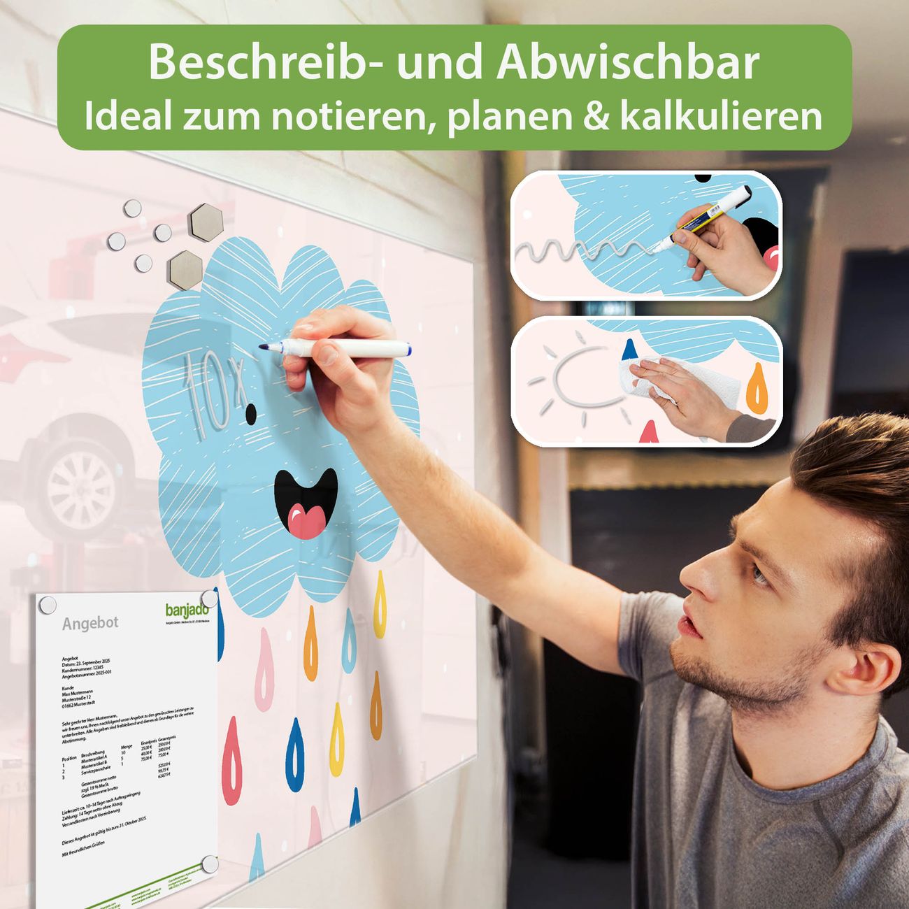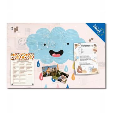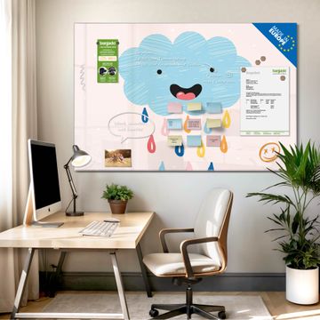 Material: 4mm Sicherheitsglas mit Metallrückwand Eigenschaften: beschreibbar, magnetisch, kratzfest Maße: 90x60x0,6cm, 8,10kg schwer Motiv Nummer 12860 glückliche Regenwolke Zubehör: inklusive 4 Neodym-Magnete