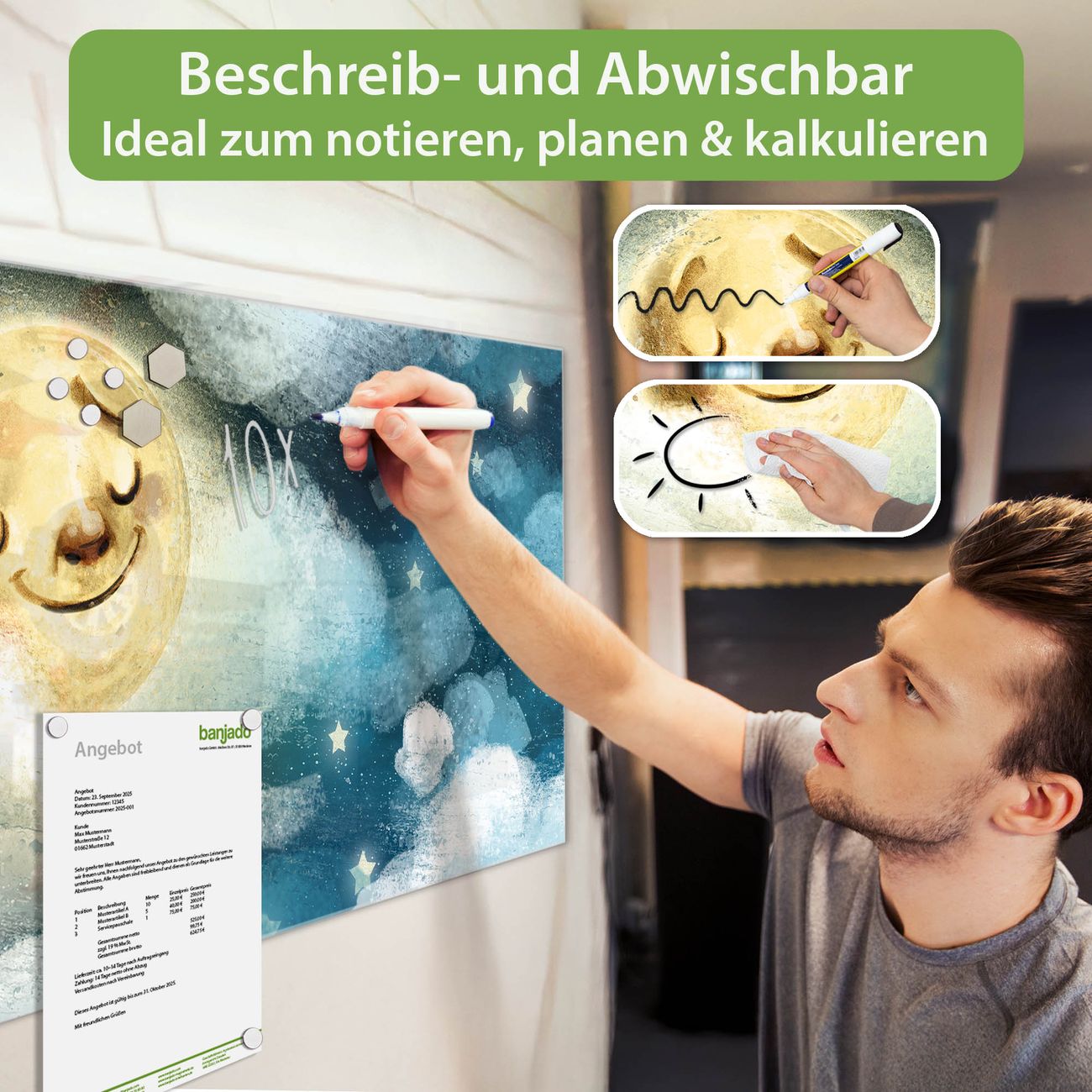 Material: 4mm Sicherheitsglas mit Metallrückwand Eigenschaften: beschreibbar, magnetisch, kratzfest Maße: 120x60x0,6cm, 10,80kg schwer Motiv Nummer 12857 Glücksmond Zubehör: inklusive 4 Neodym-Magnete