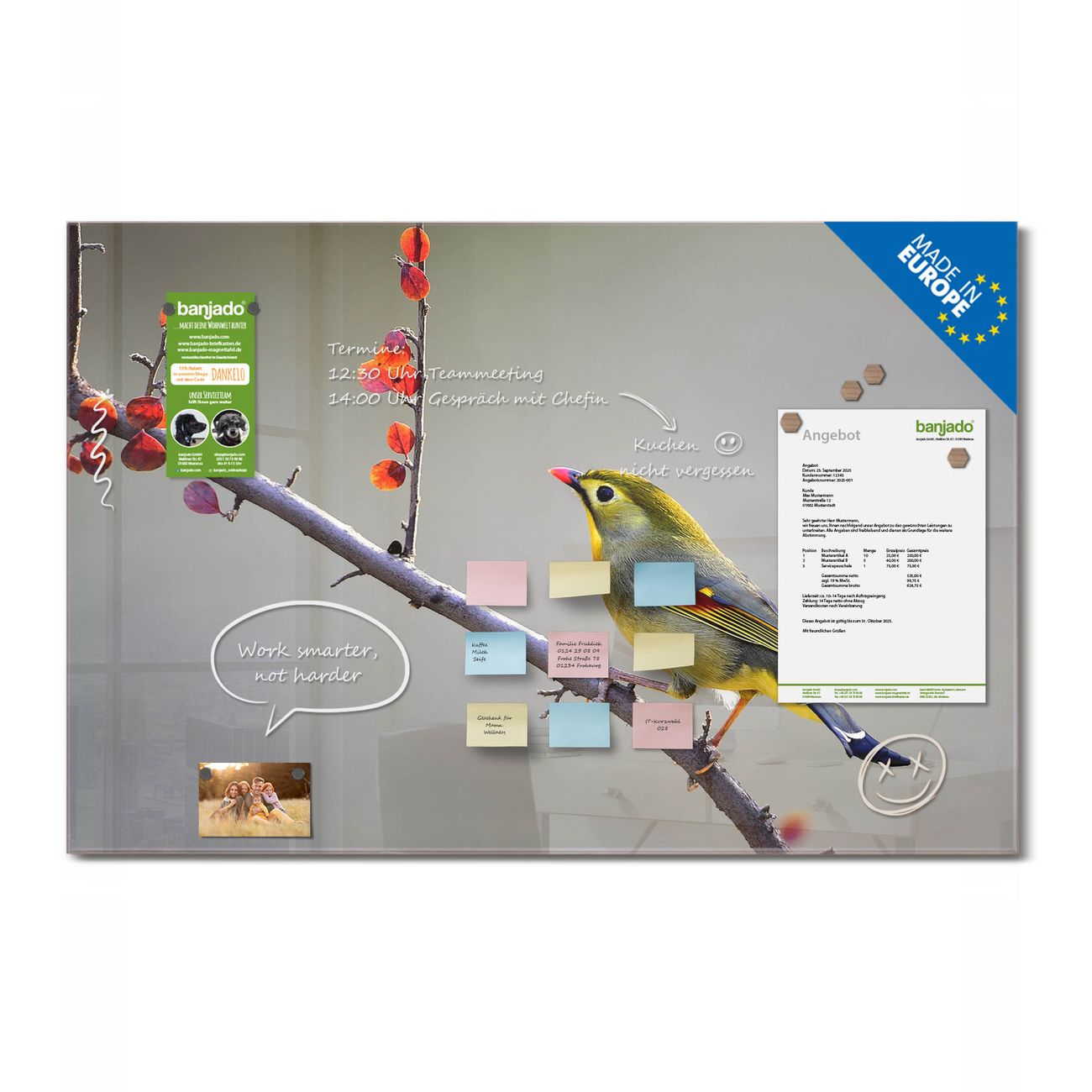 Material: 4mm Sicherheitsglas mit Metallrückwand Eigenschaften: beschreibbar, magnetisch, kratzfest Maße: 120x80x0,6cm, 14,40kg schwer Motiv Nummer 12978 Herbst Vogel Zubehör: inklusive 4 Neodym-Magnete