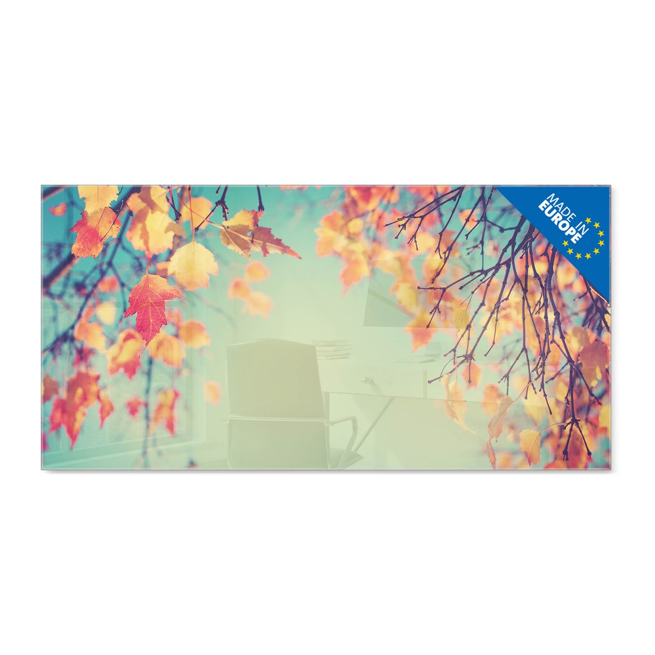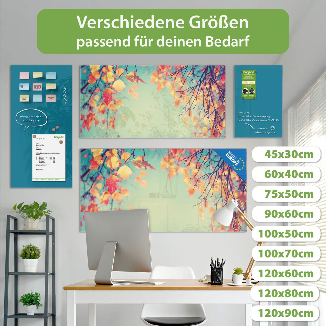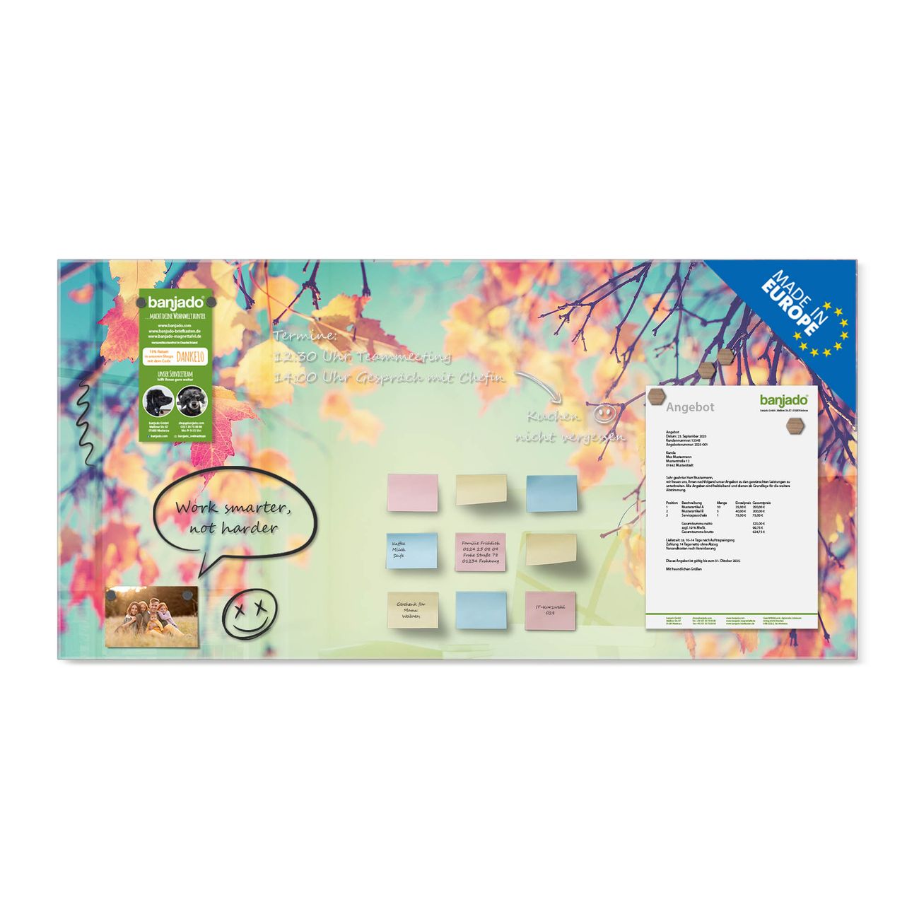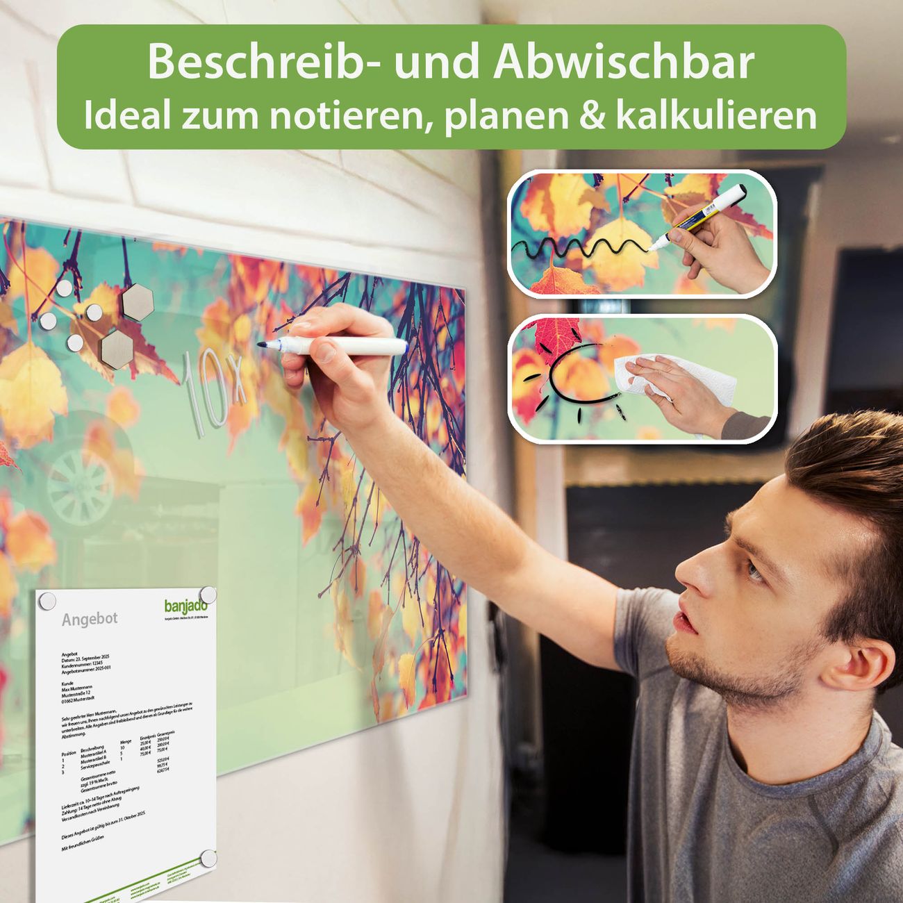 Material: 4mm Sicherheitsglas mit Metallrückwand Eigenschaften: beschreibbar, magnetisch, kratzfest Maße: 120x60x0,6cm, 10,80kg schwer Motiv Nummer 12976 Herbst Zubehör: inklusive 4 Neodym-Magnete