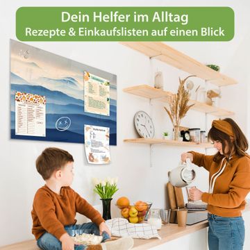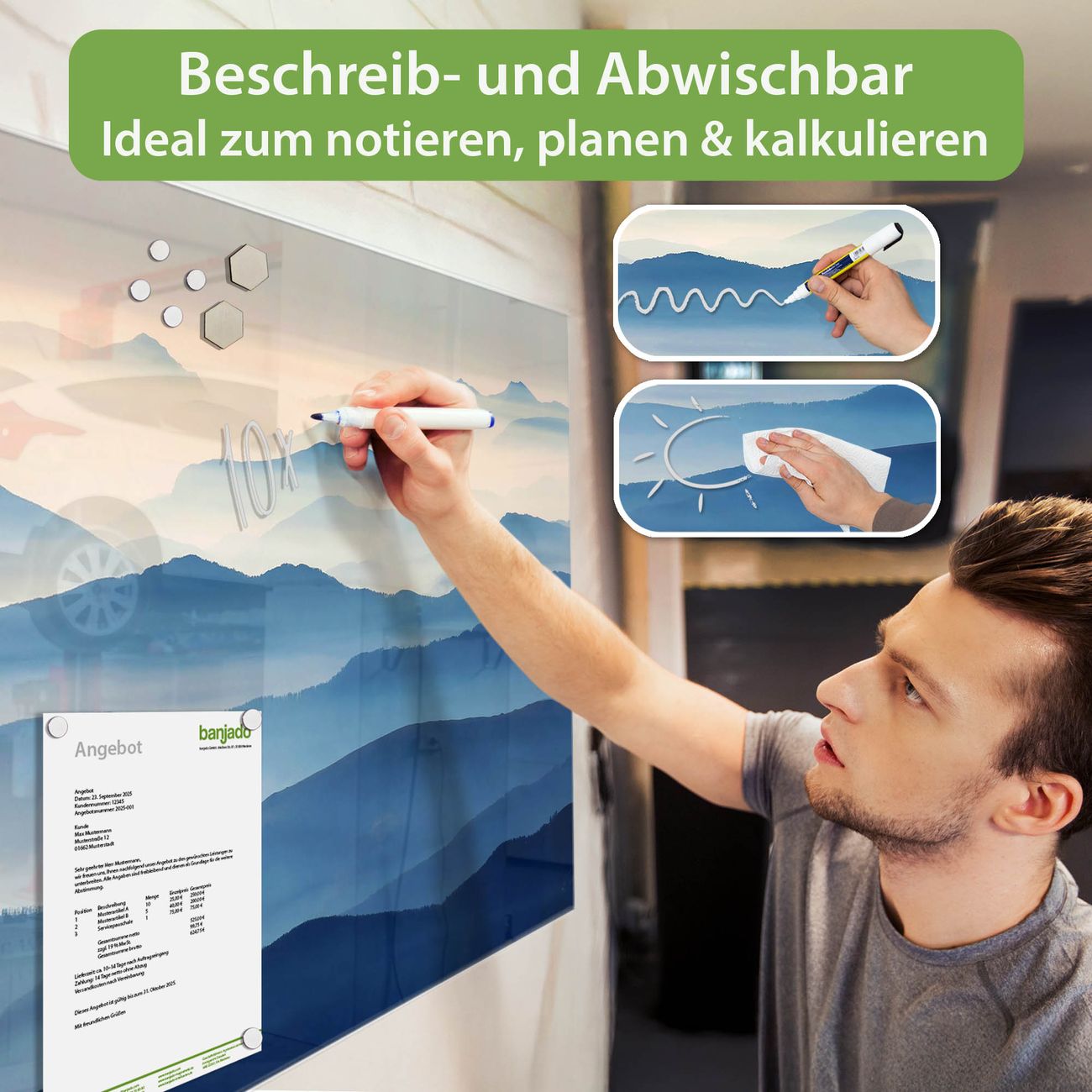 Material: 4mm Sicherheitsglas mit Metallrückwand Eigenschaften: beschreibbar, magnetisch, kratzfest Maße: 75x50x0,6cm, 5,63kg schwer Motiv Nummer 12925 Hinter den Bergen Zubehör: inklusive 4 Neodym-Magnete