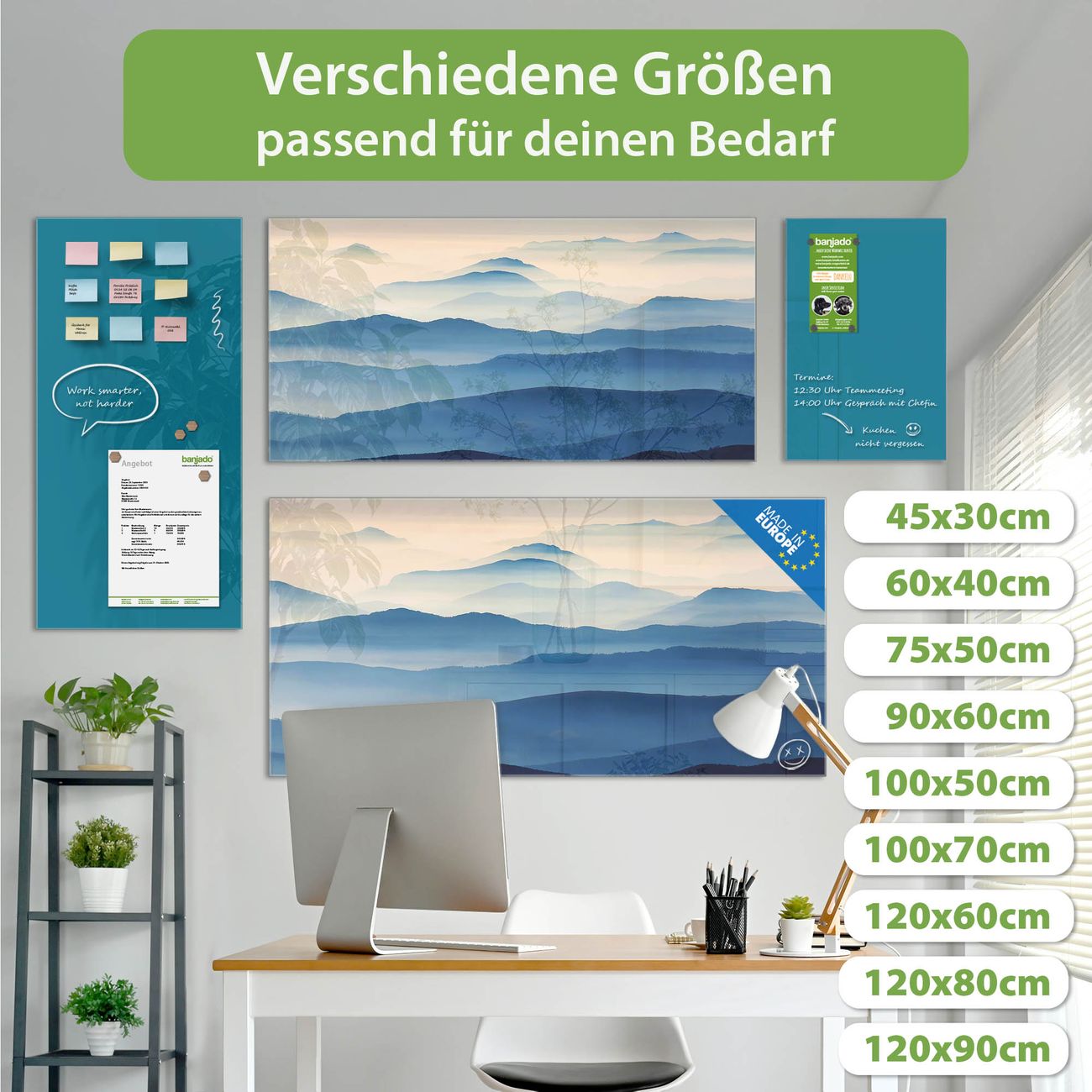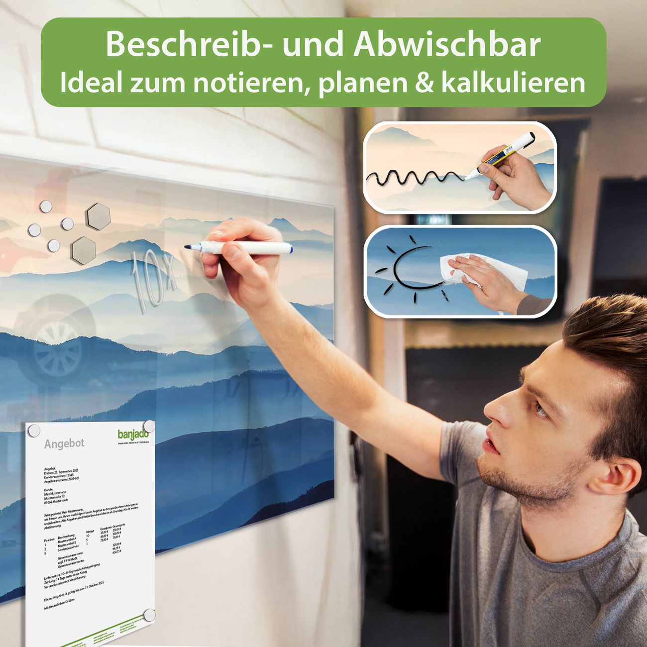 Jede Glas Magnettafel wird in unserer Werkstatt von Hand gefertigt und sorgfältig geprüft. So erhalten Sie ein echtes Qualitätsprodukt, das Funktion und Ästhetik perfekt vereint.?? Warum banjado?