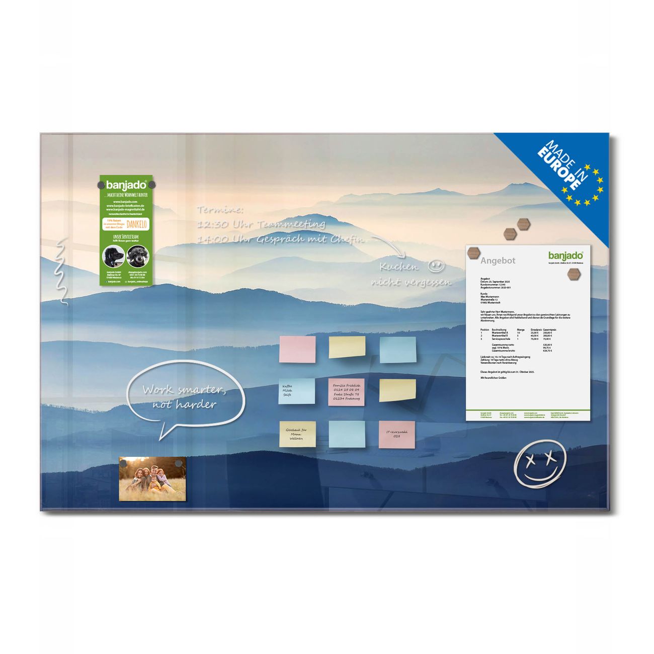 Jede Glas Magnettafel wird in unserer Werkstatt von Hand gefertigt und sorgfältig geprüft. So erhalten Sie ein echtes Qualitätsprodukt, das Funktion und Ästhetik perfekt vereint.?? Warum banjado?