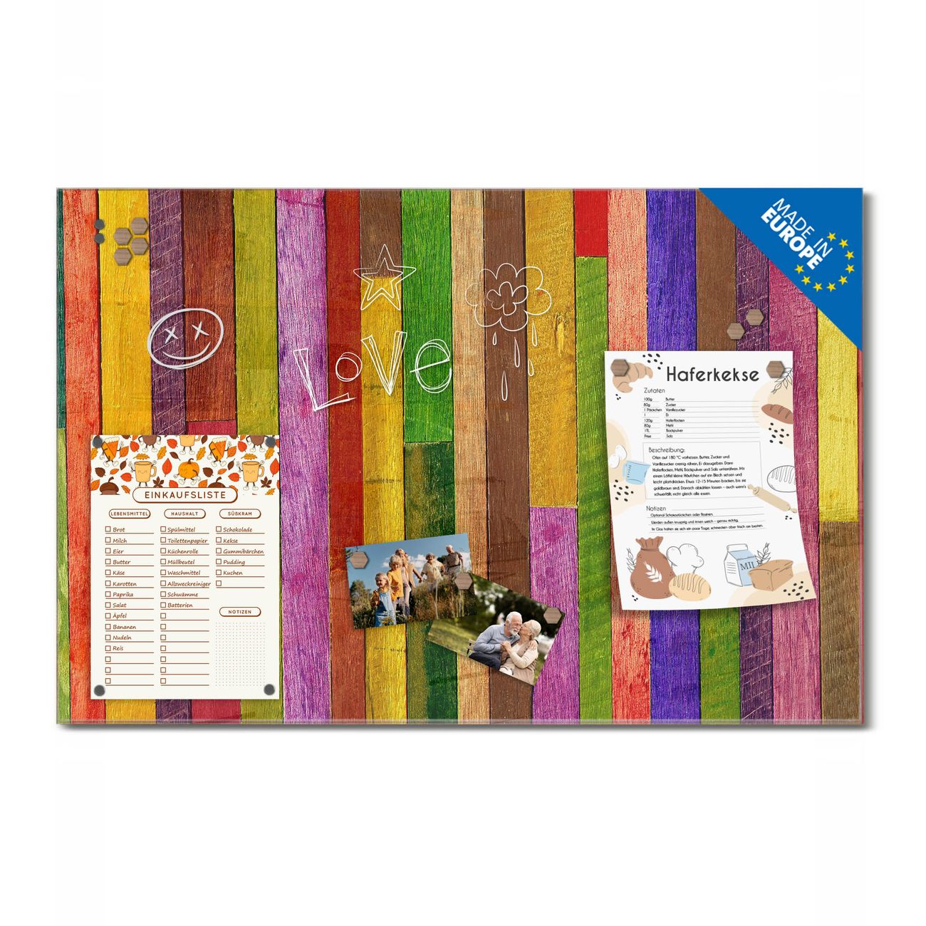 Material: 4mm Sicherheitsglas mit Metallrückwand Eigenschaften: beschreibbar, magnetisch, kratzfest Maße: 60x40x0,6cm, 3,6kg schwer Motiv Nummer 10863 Holz Collage Bunt Zubehör: inklusive 4 Neodym-Magnete