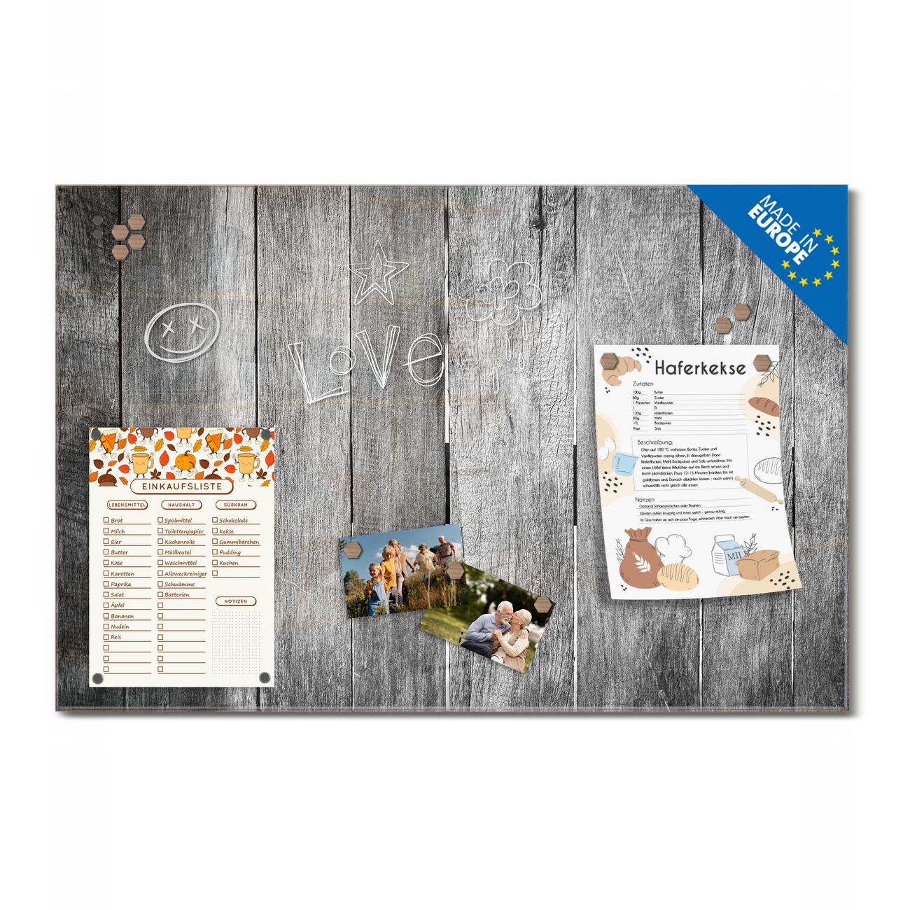 Material: 4mm Sicherheitsglas mit Metallrückwand Eigenschaften: beschreibbar, magnetisch, kratzfest Maße: 75x50x0,6cm, 5,63kg schwer Motiv Nummer 12211 Holz Monochrom Zubehör: inklusive 4 Neodym-Magnete