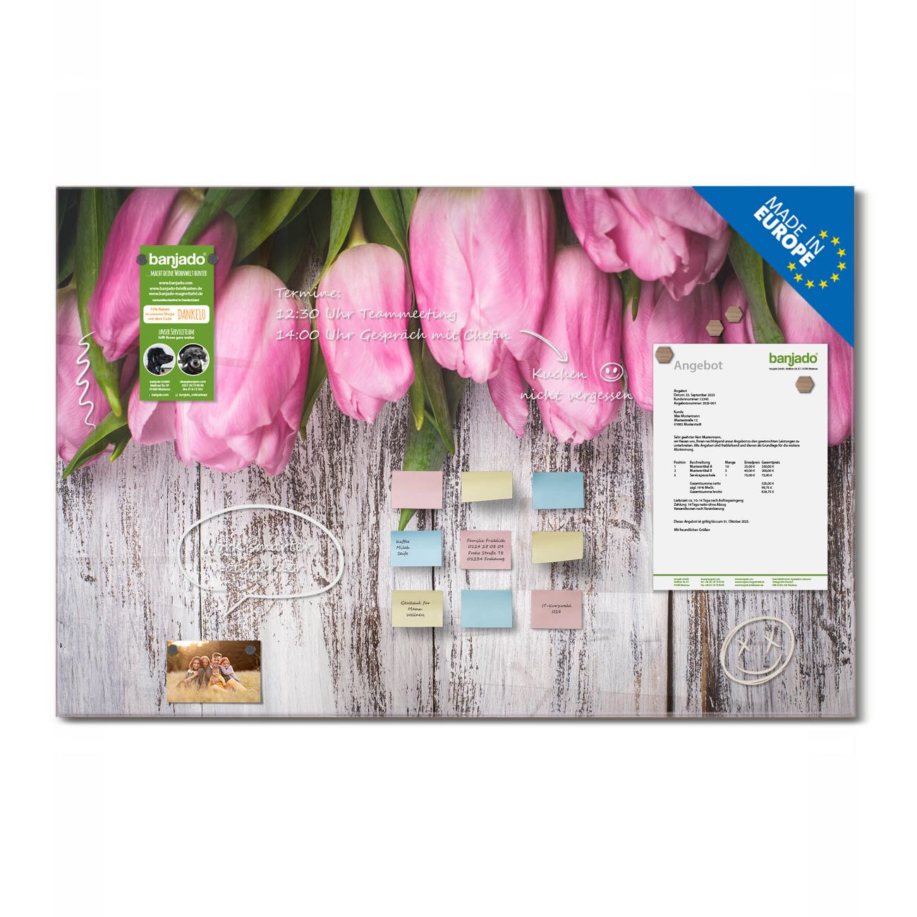 Jede Glas Magnettafel wird in unserer Werkstatt von Hand gefertigt und sorgfältig geprüft. So erhalten Sie ein echtes Qualitätsprodukt, das Funktion und Ästhetik perfekt vereint.?? Warum banjado?