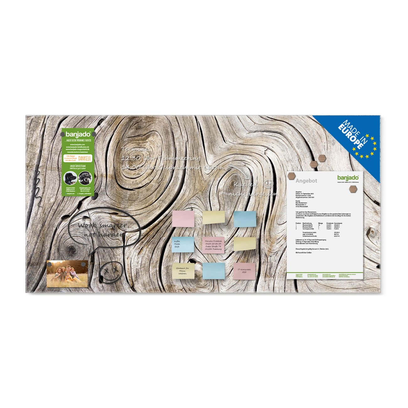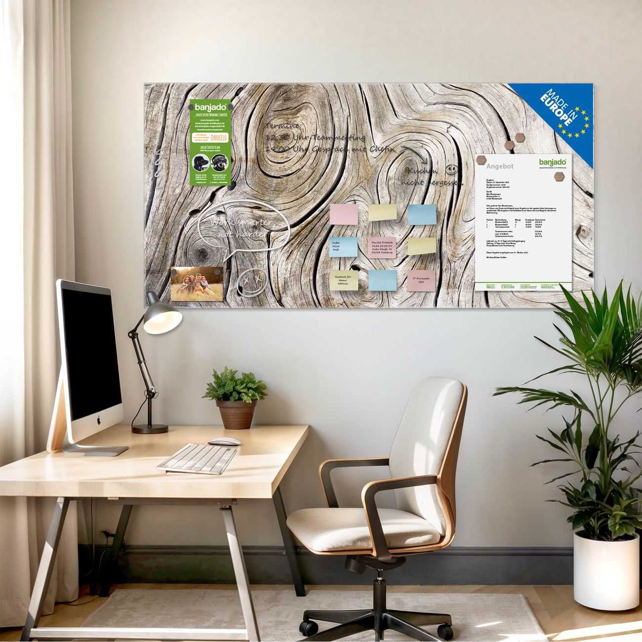 Jede Glas Magnettafel wird in unserer Werkstatt von Hand gefertigt und sorgfältig geprüft. So erhalten Sie ein echtes Qualitätsprodukt, das Funktion und Ästhetik perfekt vereint.?? Warum banjado?