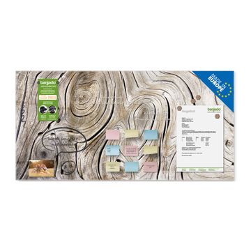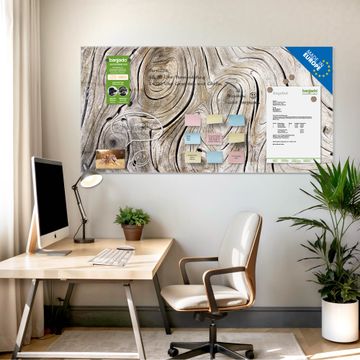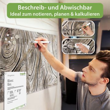 Material: 4mm Sicherheitsglas mit Metallrückwand Eigenschaften: beschreibbar, magnetisch, kratzfest Maße: 100x50x0,6cm, 7,50kg schwer Motiv Nummer 12774 Holzwirbel Zubehör: inklusive 4 Neodym-Magnete