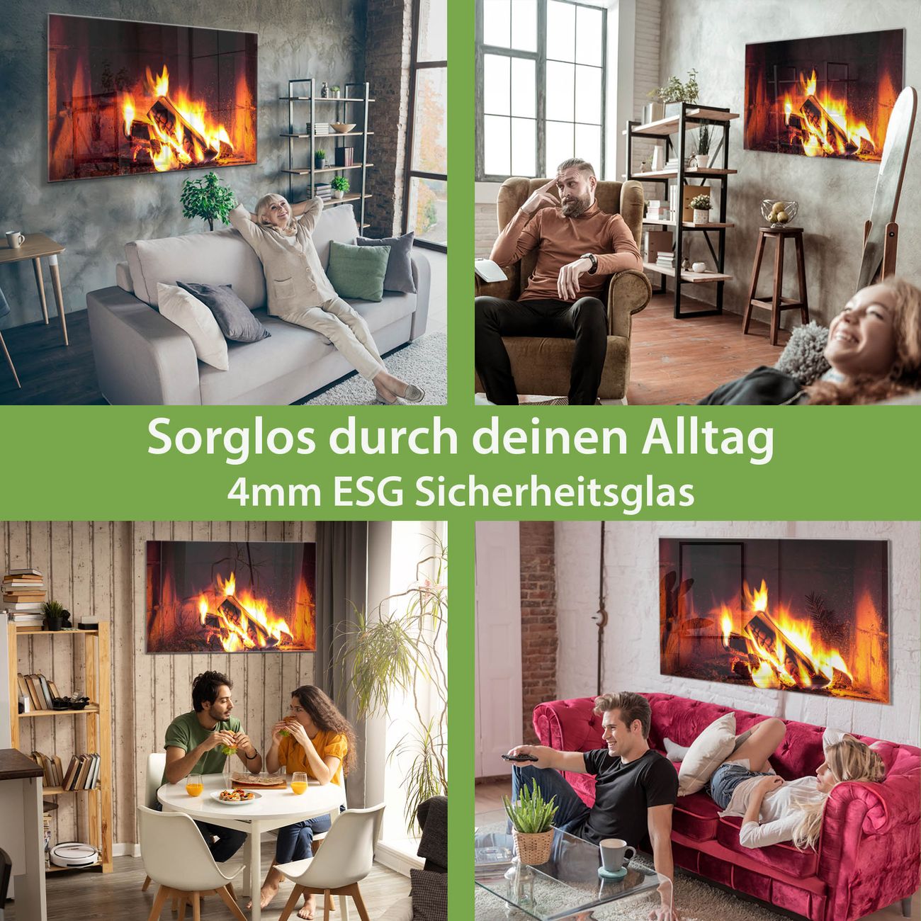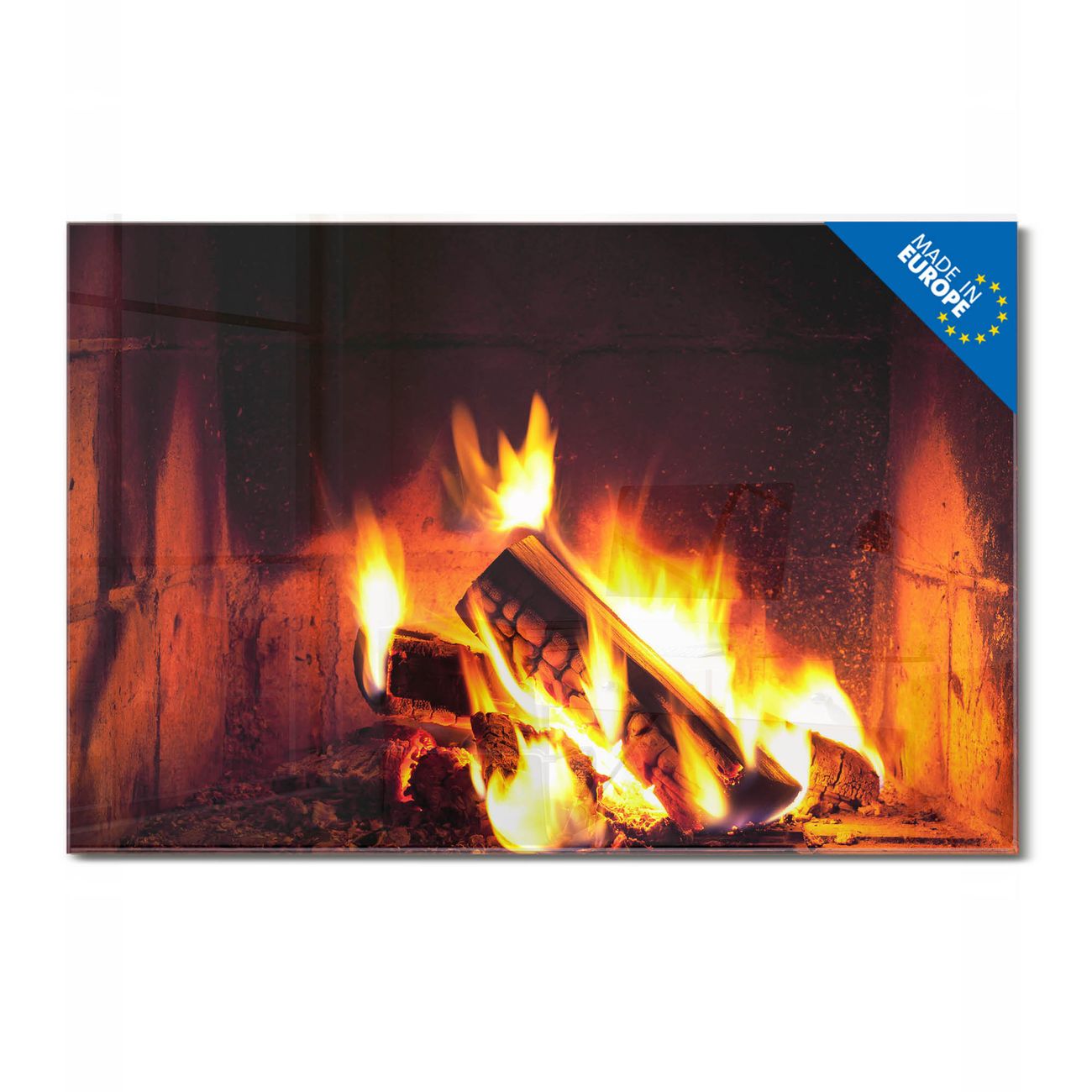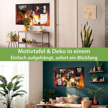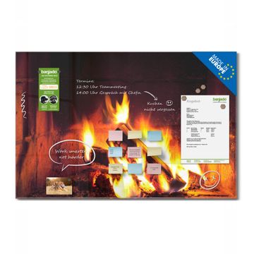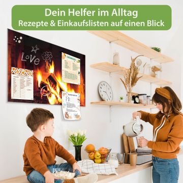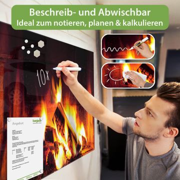 Material: 4mm Sicherheitsglas mit Metallrückwand Eigenschaften: beschreibbar, magnetisch, kratzfest Maße: 120x80x0,6cm, 14,40kg schwer Motiv Nummer 12929 Kaminfeuer Zubehör: inklusive 4 Neodym-Magnete
