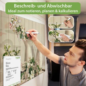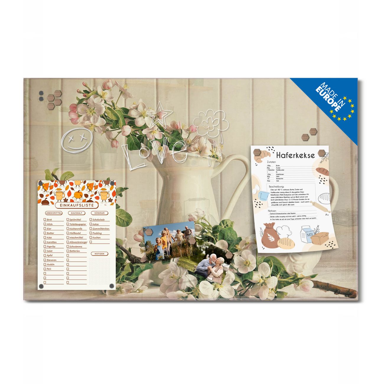 Material: 4mm Sicherheitsglas mit Metallrückwand Eigenschaften: beschreibbar, magnetisch, kratzfest Maße: 45x30x0,6cm, 2,03kg schwer Motiv Nummer 12074 Kirschzweige Zubehör: inklusive 4 Neodym-Magnete