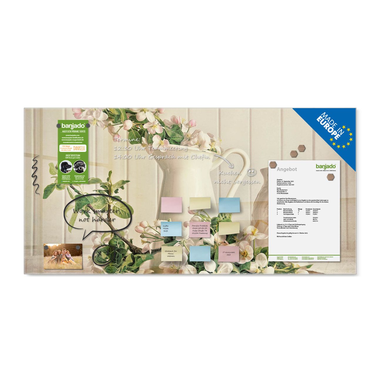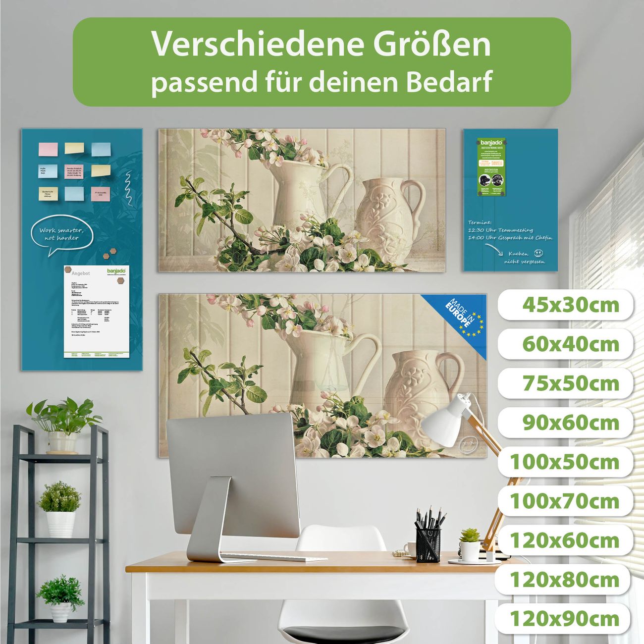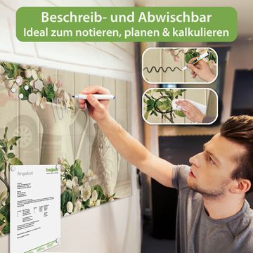 Material: 4mm Sicherheitsglas mit Metallrückwand Eigenschaften: beschreibbar, magnetisch, kratzfest Maße: 100x50x0,6cm, 7,50kg schwer Motiv Nummer 12074 Kirschzweige Zubehör: inklusive 4 Neodym-Magnete