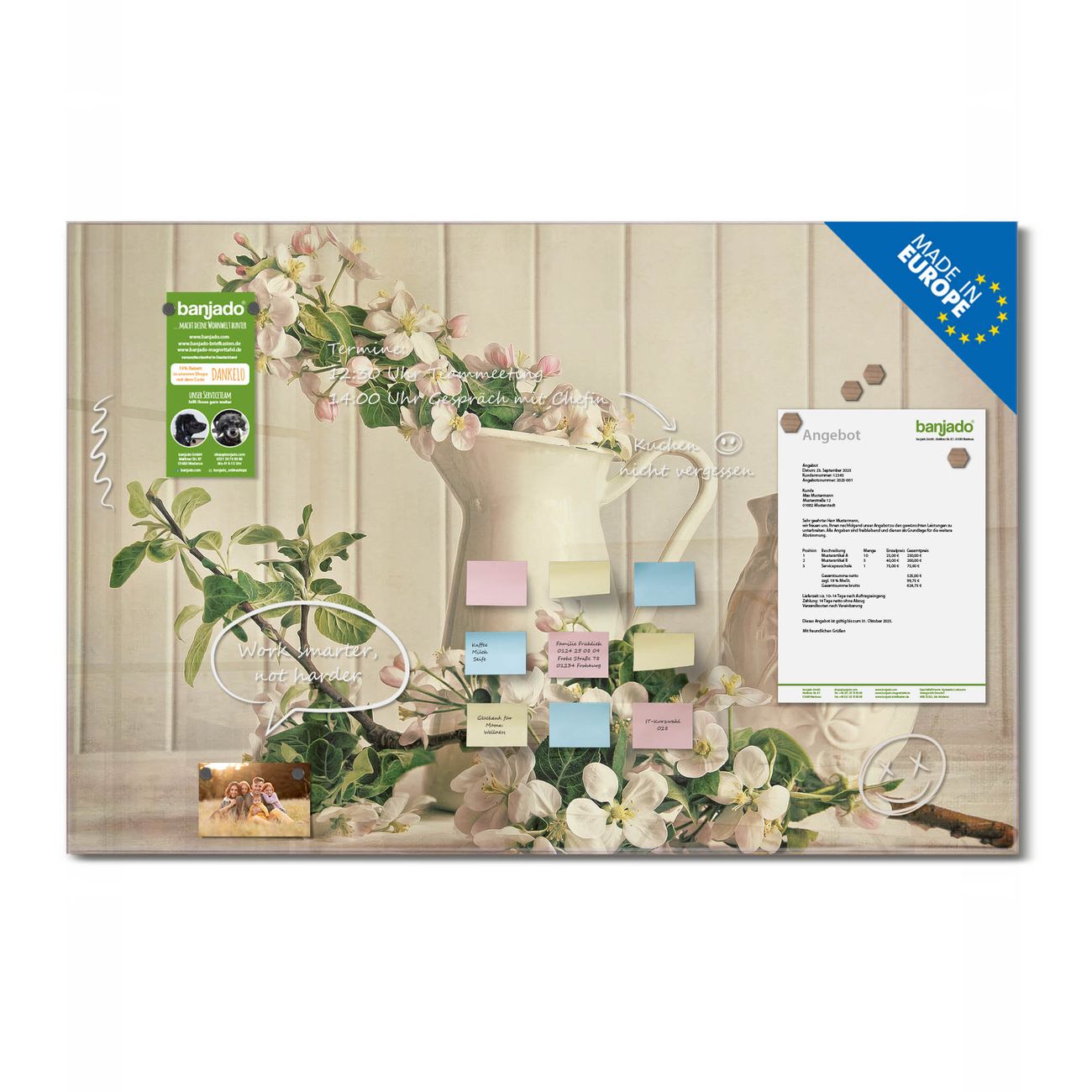 Jede Glas Magnettafel wird in unserer Werkstatt von Hand gefertigt und sorgfältig geprüft. So erhalten Sie ein echtes Qualitätsprodukt, das Funktion und Ästhetik perfekt vereint.?? Warum banjado?