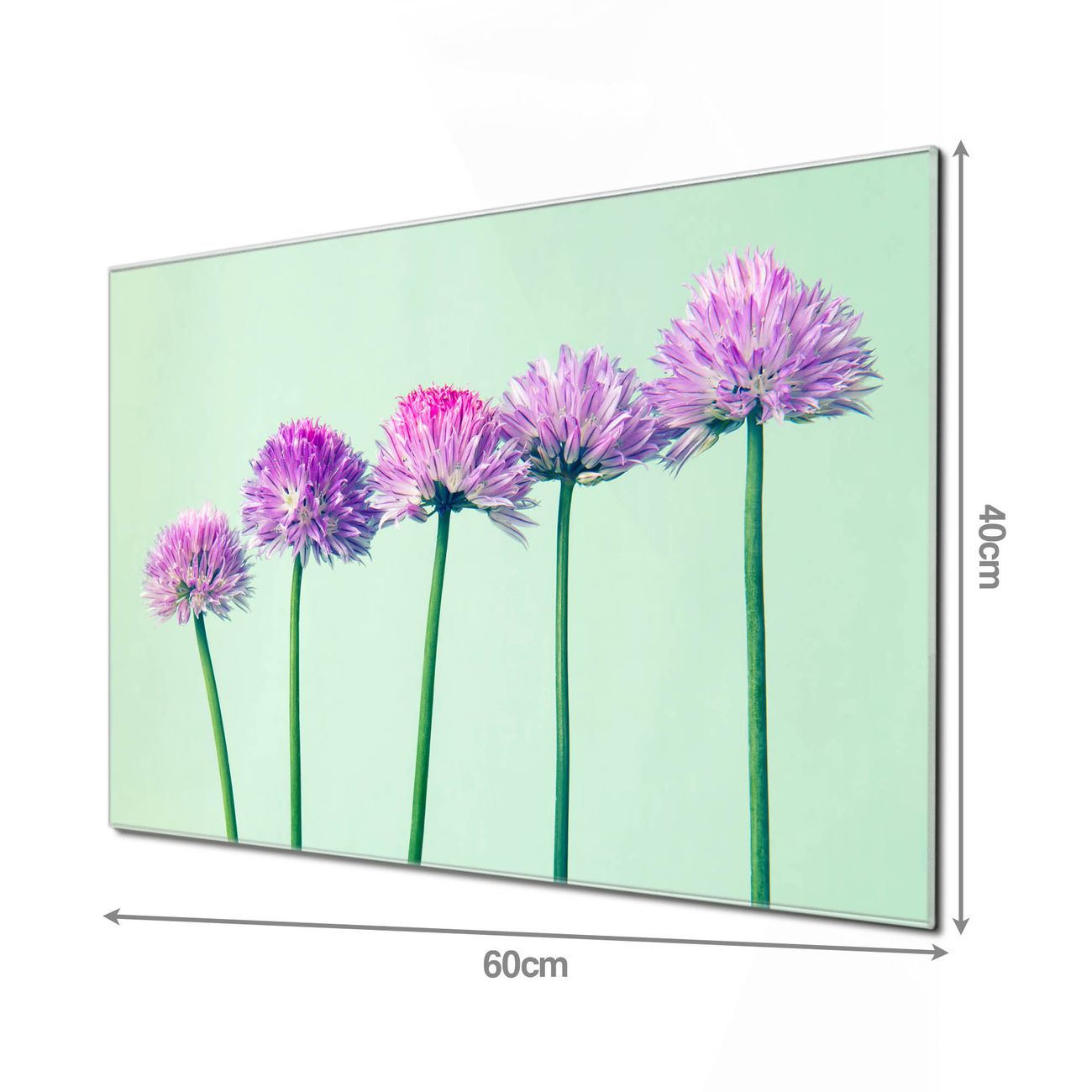 Material: 4mm Sicherheitsglas mit Metallrückwand Eigenschaften: beschreibbar, magnetisch, kratzfest Maße: 60x40x0,6cm, 3,6kg schwer Motiv Nummer 12935 Klee in Reihe Zubehör: inklusive 4 Neodym-Magnete