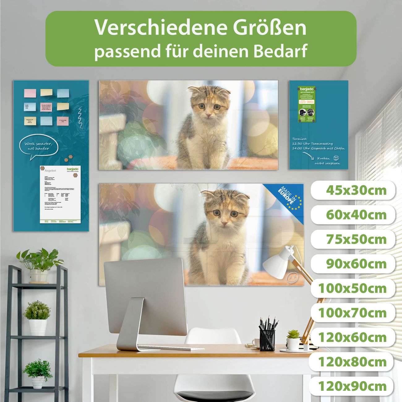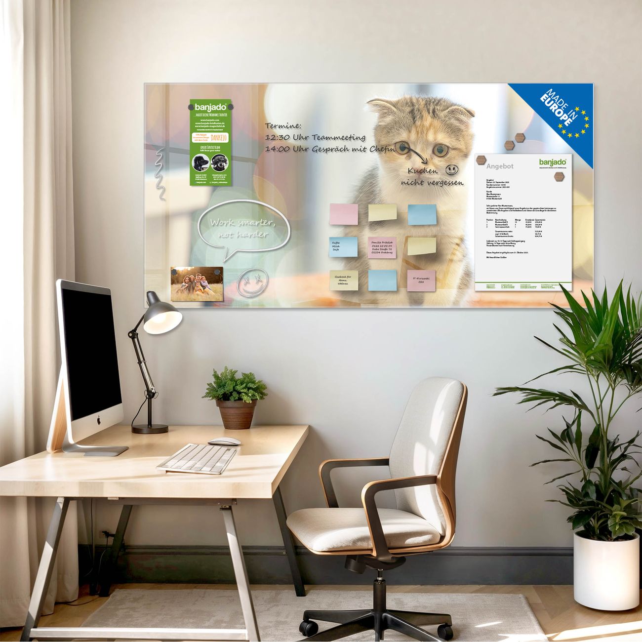 Die banjado Glas Magnettafel mit dem Motiv Motiv Kleine Katze verbindet Funktionalität mit Stil. Sie ersetzt das Zettelchaos durch klare Strukturen und bringt dabei eine warme, natürliche Atmosphäre in Ihr Zuhause. Ob im Büro, in der Küche oder im Eingangsbereich - dieses Design-Board zieht Blicke an und sorgt für Ordnung mit Charakter.