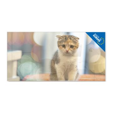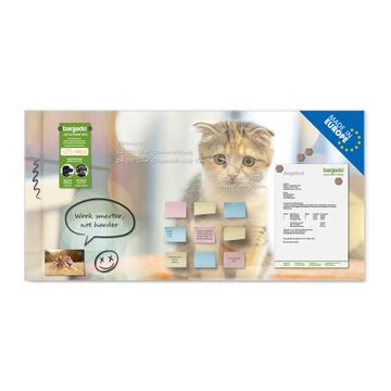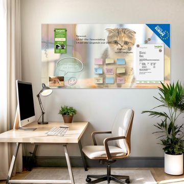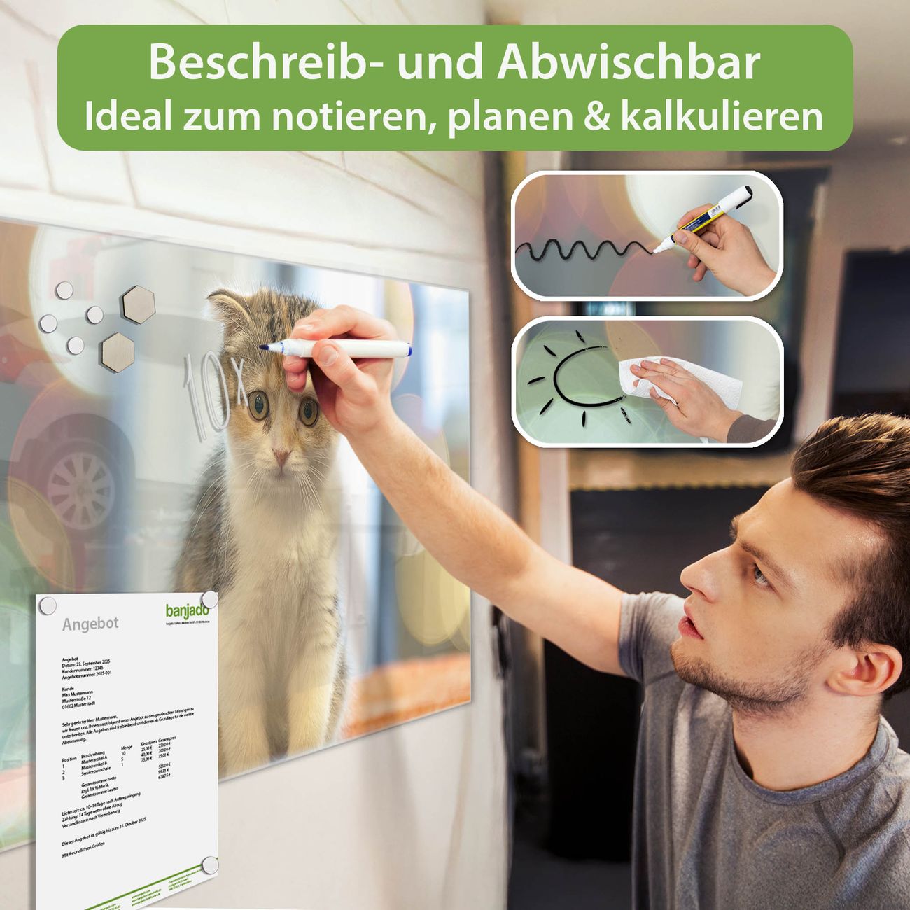 Material: 4mm Sicherheitsglas mit Metallrückwand Eigenschaften: beschreibbar, magnetisch, kratzfest Maße: 100x50x0,6cm, 7,50kg schwer Motiv Nummer 12791 Kleine Katze Zubehör: inklusive 4 Neodym-Magnete