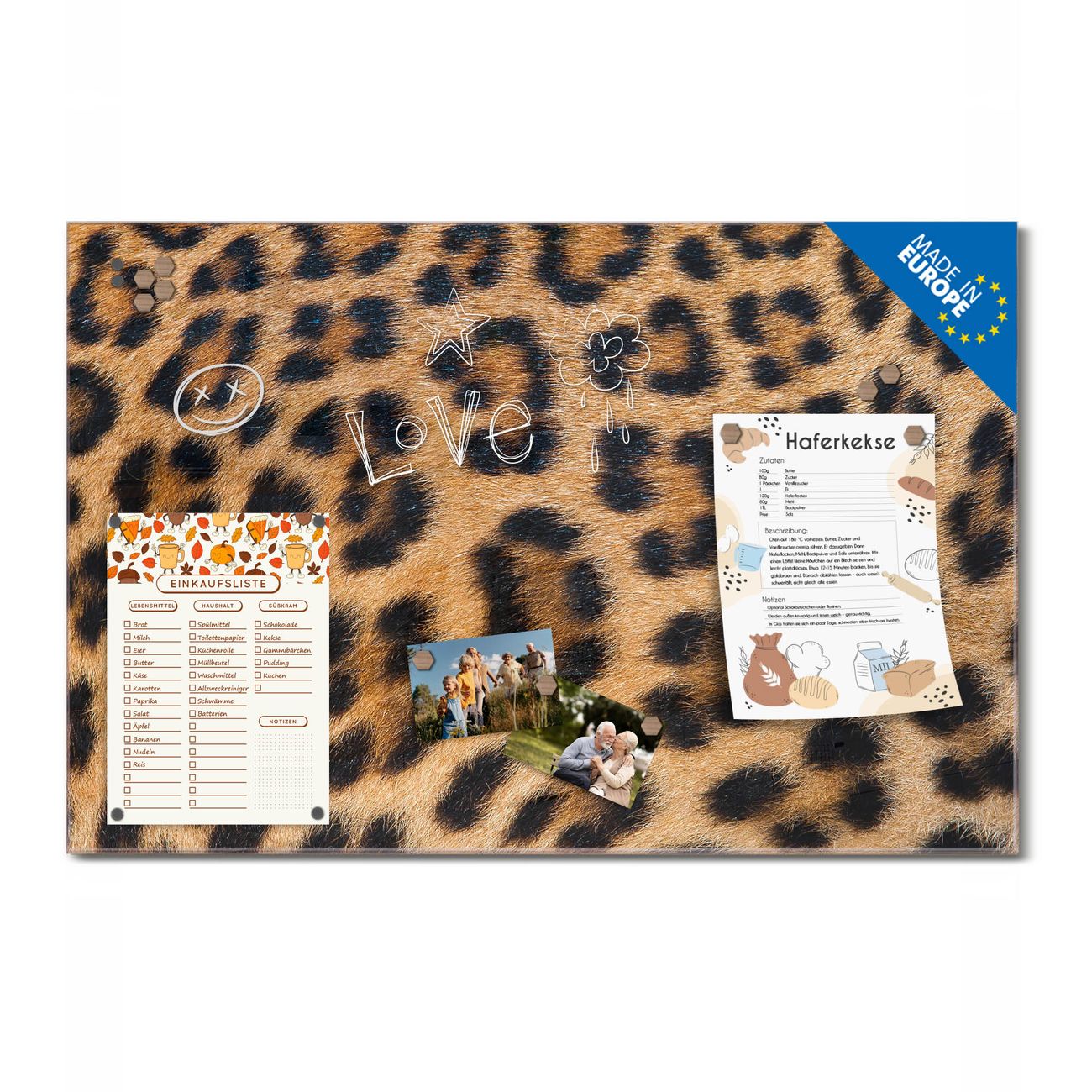 Ein Stück Design, das Ihren Alltag organisiert. Schreiben, heften, inspirieren - alles an einem Ort. Qualität, die man spürt. Montage leicht gemacht. Handwerk mit Herz - veredelt in Sachsen. Einzigartiges Design mit Motiv Motiv Leopardenfell Beschreibbare Glasoberfläche, leicht zu reinigen Starke Magnetkraft durch Stahlrückwand Inklusive 4 Neodym-Magneten Flexible Montageoptionen Handveredelt in Sachsen - Qualität, die bleibt