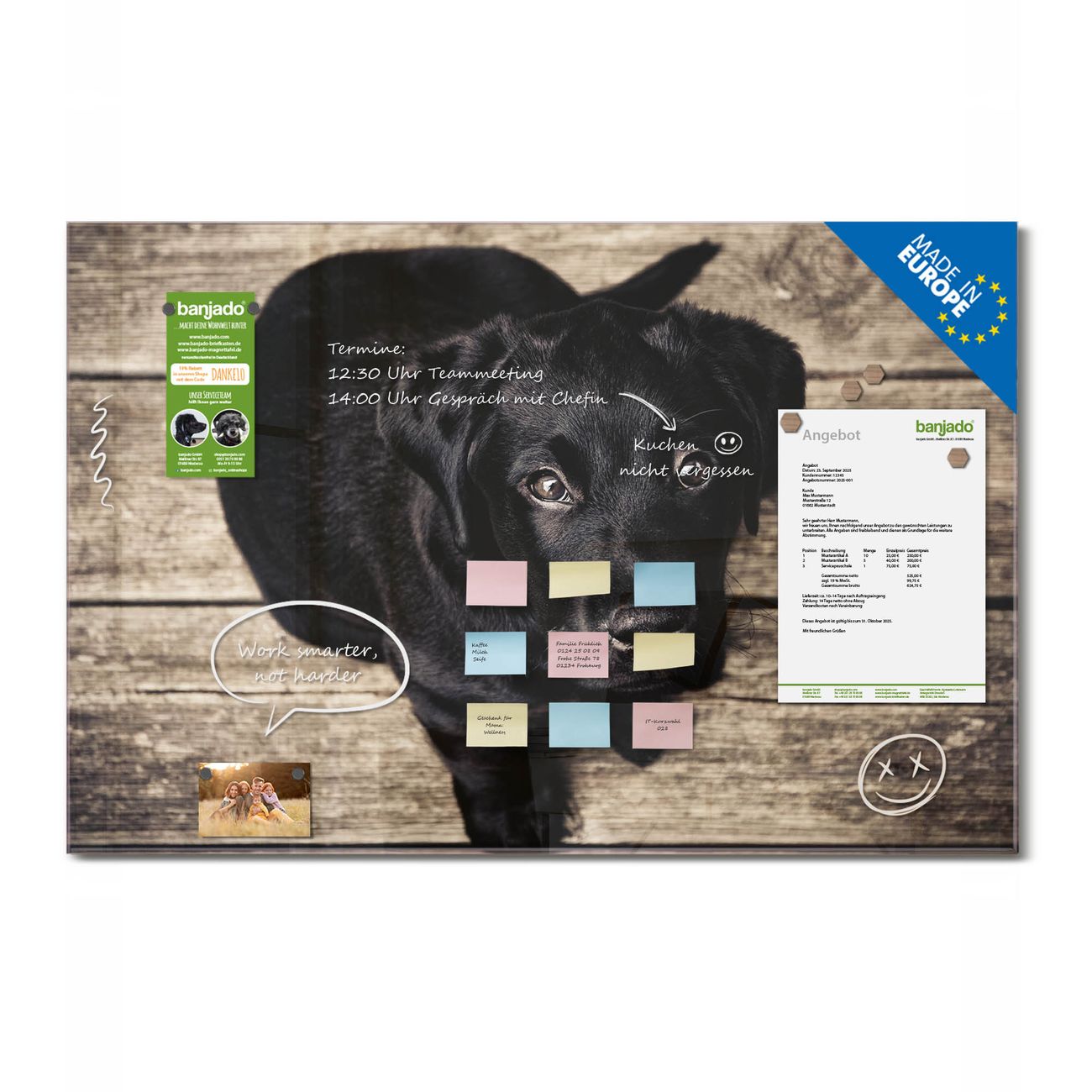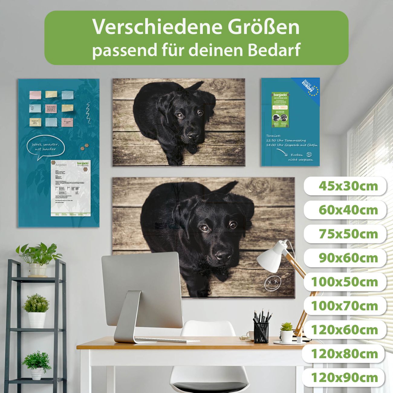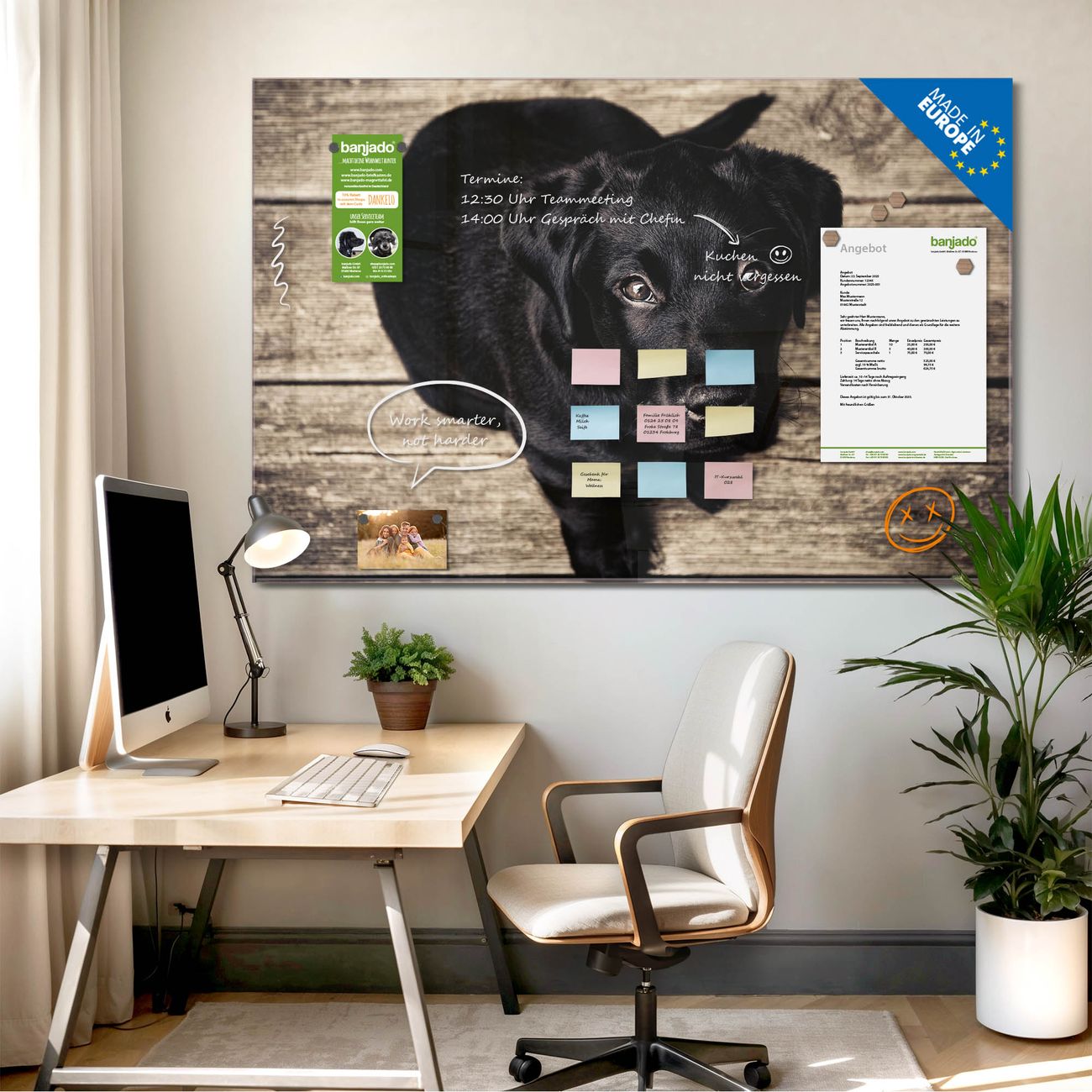 Jede Glas Magnettafel wird in unserer Werkstatt von Hand gefertigt und sorgfältig geprüft. So erhalten Sie ein echtes Qualitätsprodukt, das Funktion und Ästhetik perfekt vereint.?? Warum banjado?
