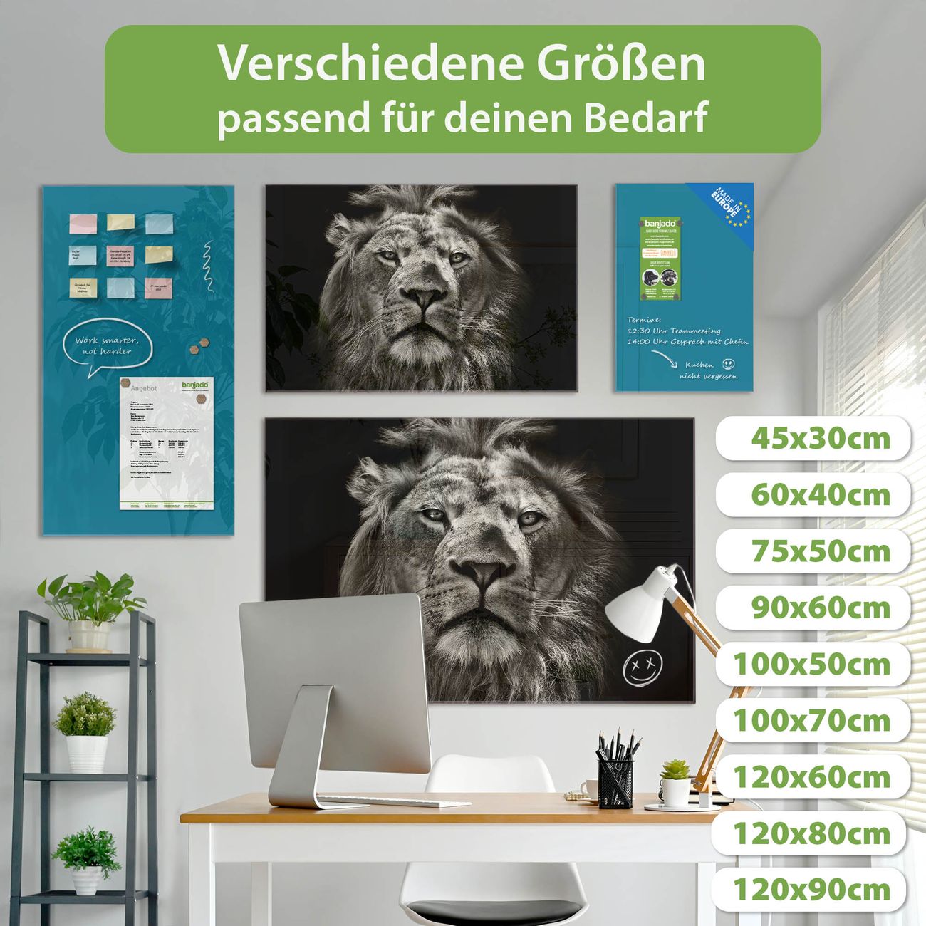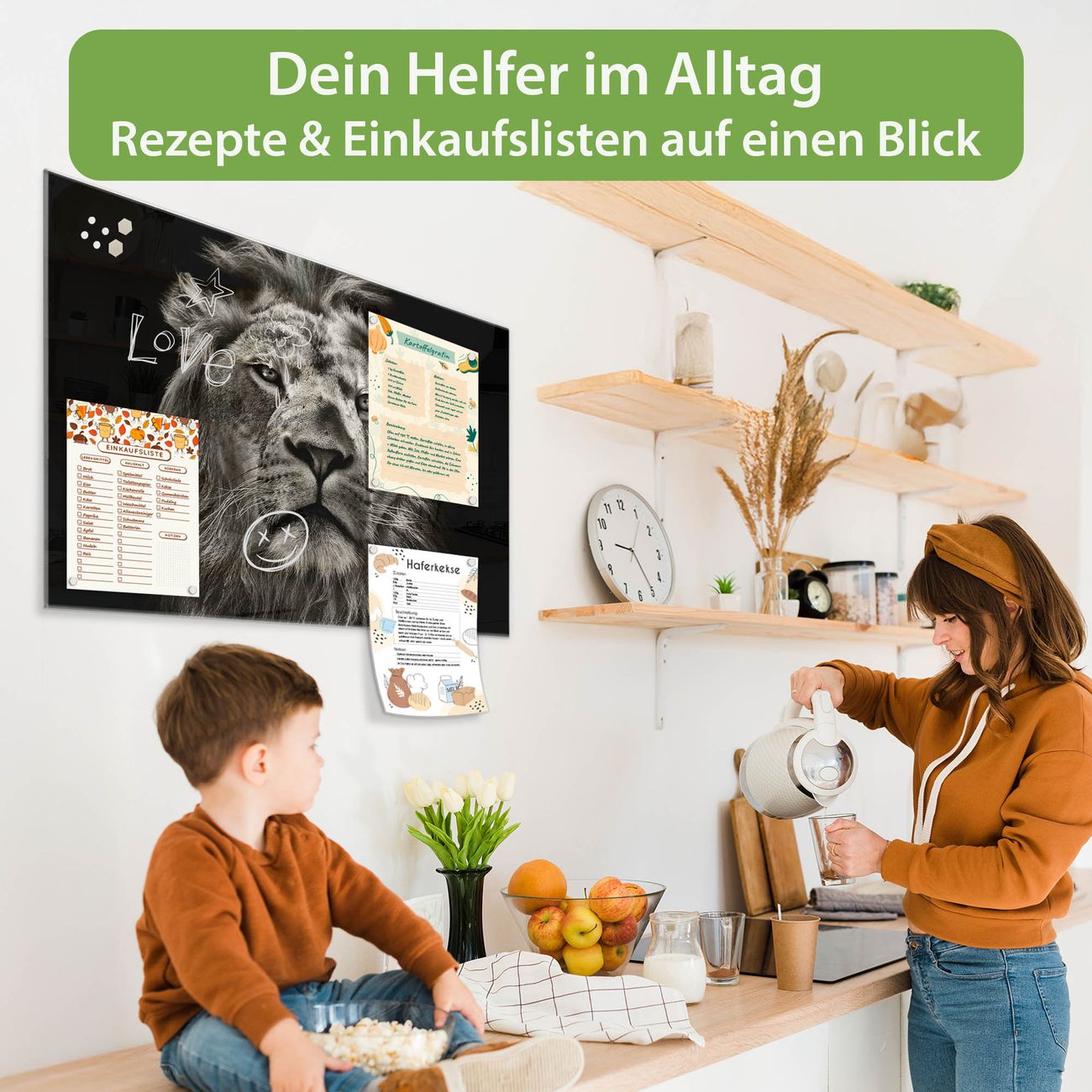 Ein Stück Design, das Ihren Alltag organisiert. Schreiben, heften, inspirieren - alles an einem Ort. Qualität, die man spürt. Montage leicht gemacht. Handwerk mit Herz - veredelt in Sachsen. Einzigartiges Design mit Motiv Motiv Löwe Porträt Beschreibbare Glasoberfläche, leicht zu reinigen Starke Magnetkraft durch Stahlrückwand Inklusive 4 Neodym-Magneten Flexible Montageoptionen Handveredelt in Sachsen - Qualität, die bleibt