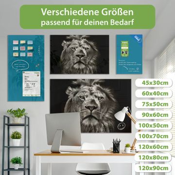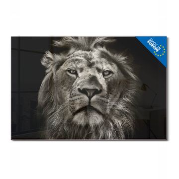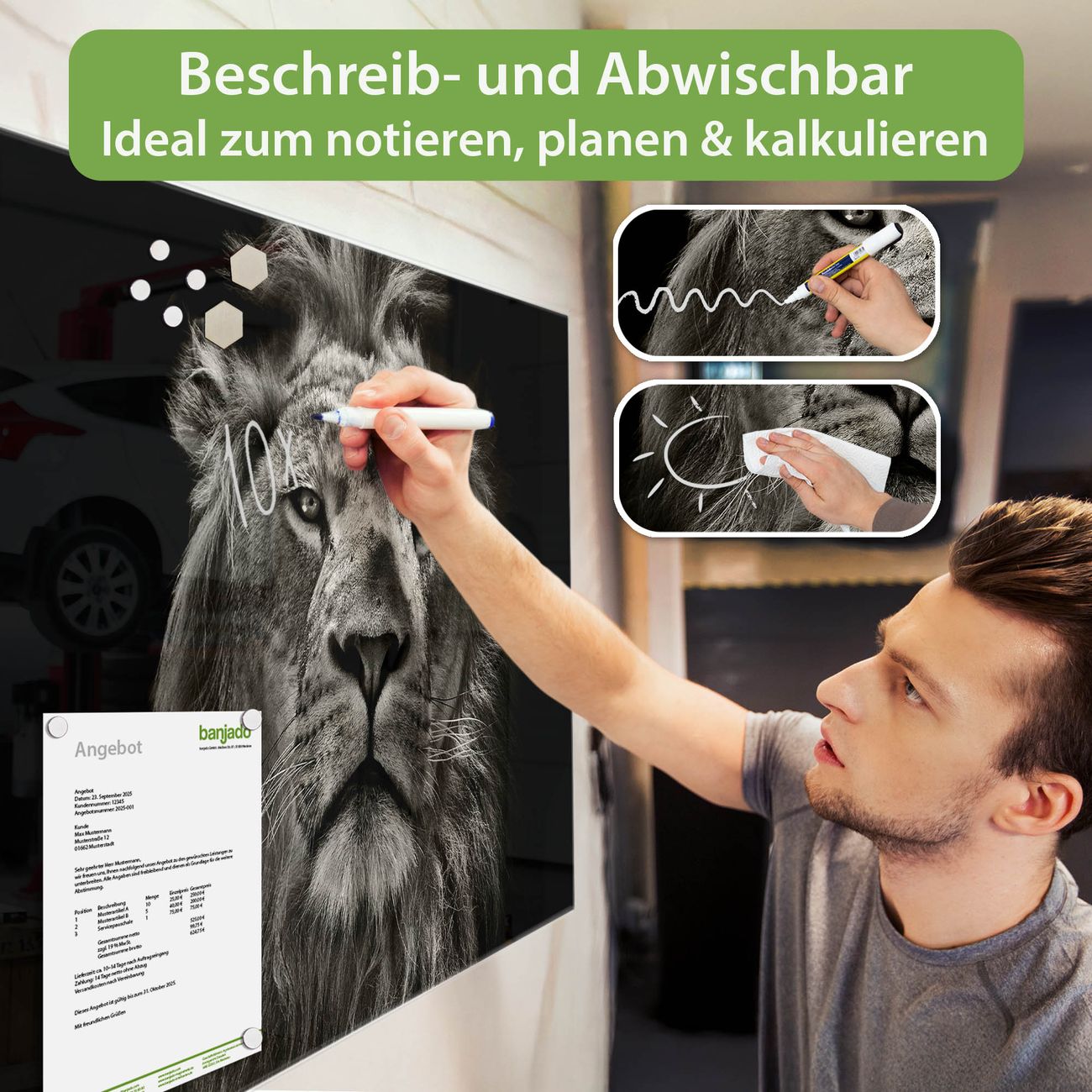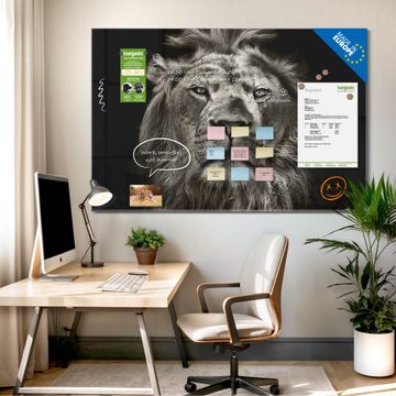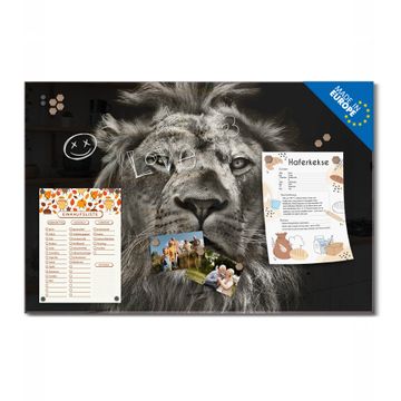 Material: 4mm Sicherheitsglas mit Metallrückwand Eigenschaften: beschreibbar, magnetisch, kratzfest Maße: 75x50x0,6cm, 5,63kg schwer Motiv Nummer 12968 Löwe Porträt Zubehör: inklusive 4 Neodym-Magnete